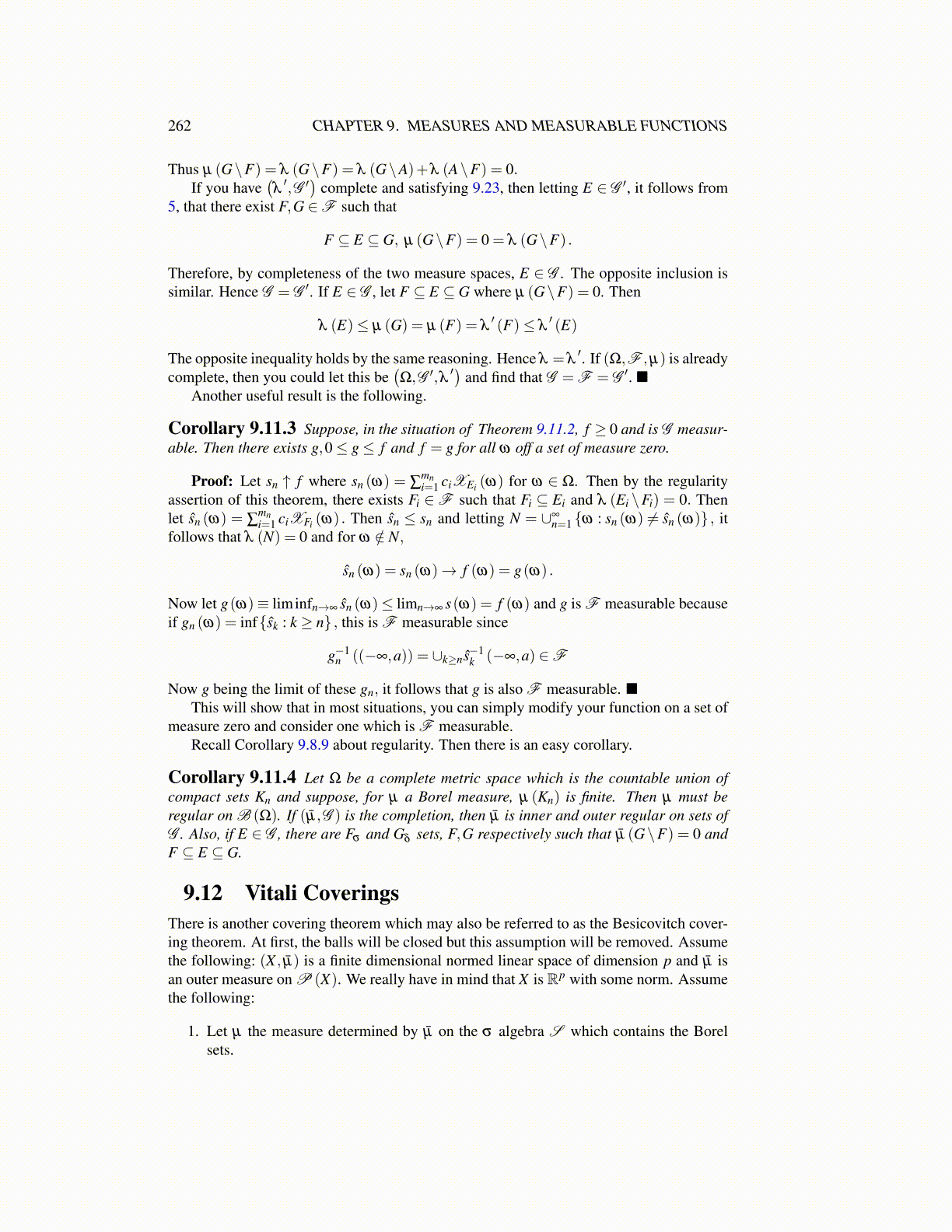Corollary 9.11.4 Let Ω be a complete metric space which is the countable union ofcompact sets Kn and suppose, for µ a Borel measure, µ (Kn) is finite. Then µ must beregular on B (Ω). If (µ̄,G ) is the completion, then µ̄ is inner and outer regular on sets ofG . Also, if E ∈ G , there are Fσ and Gδ sets, F,G respectively such that µ̄ (G\F) = 0 andF ⊆ E ⊆ G.