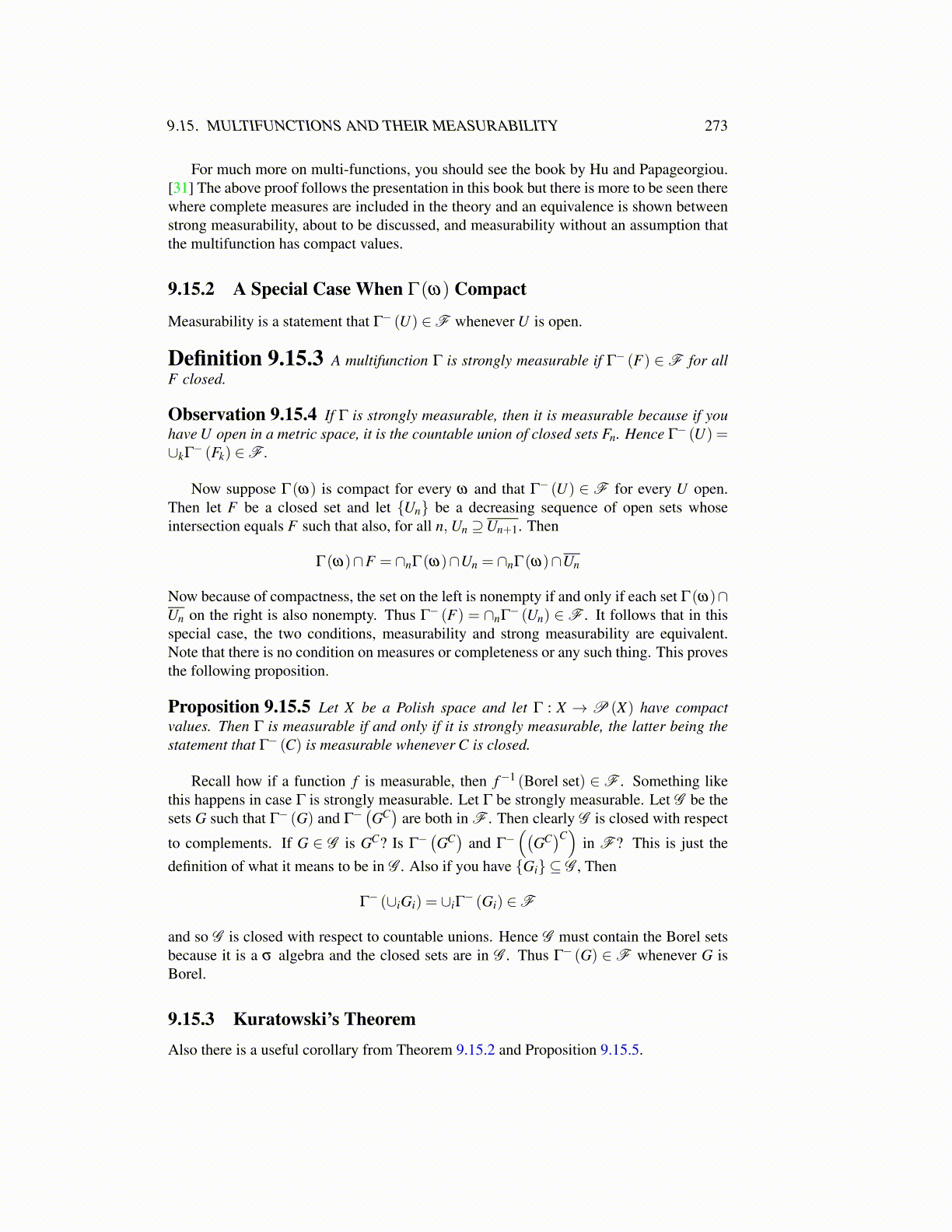 Observation 9.15.4 If Γ is strongly measurable, then it is measurable because if youhave U open in a metric space, it is the countable union of closed sets Fn. Hence Γ− (U) =∪kΓ− (Fk) ∈F .