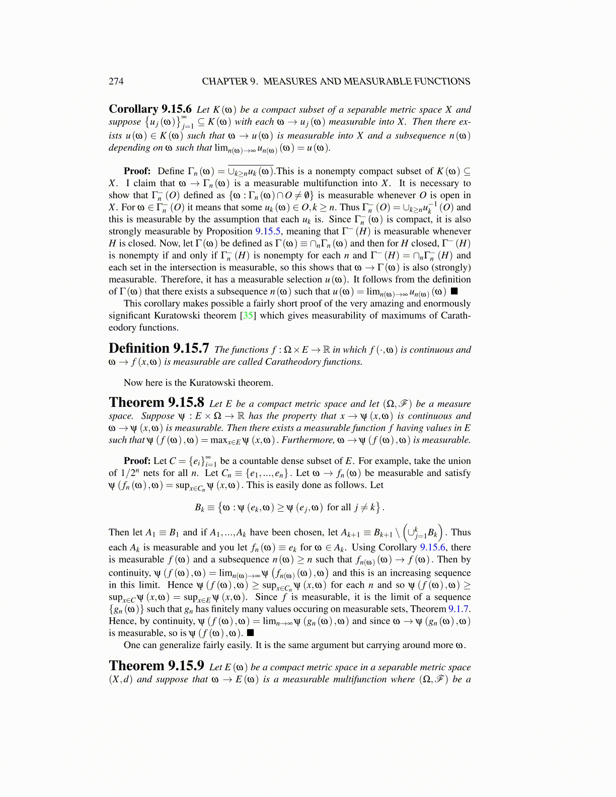 k (O) andthis is measurable by the assumption that each uk is. Since Γ−n (ω) is compact, it is alsostrongly measurable by Proposition 9.15.5, meaning that Γ− (H) is measurable wheneverH is closed. Now, let Γ(ω) be defined as Γ(ω)≡∩nΓn (ω) and then for H closed, Γ− (H)is nonempty if and only if Γ−n (H) is nonempty for each n and Γ− (H) = ∩nΓ−n (H) andeach set in the intersection is measurable, so this shows that ω → Γ(ω) is also (strongly)measurable. Therefore, it has a measurable selection u(ω). It follows from the definitionof Γ(ω) that there exists a subsequence n(ω) such that u(ω) = limn(ω)→∞ un(ω) (ω) ■