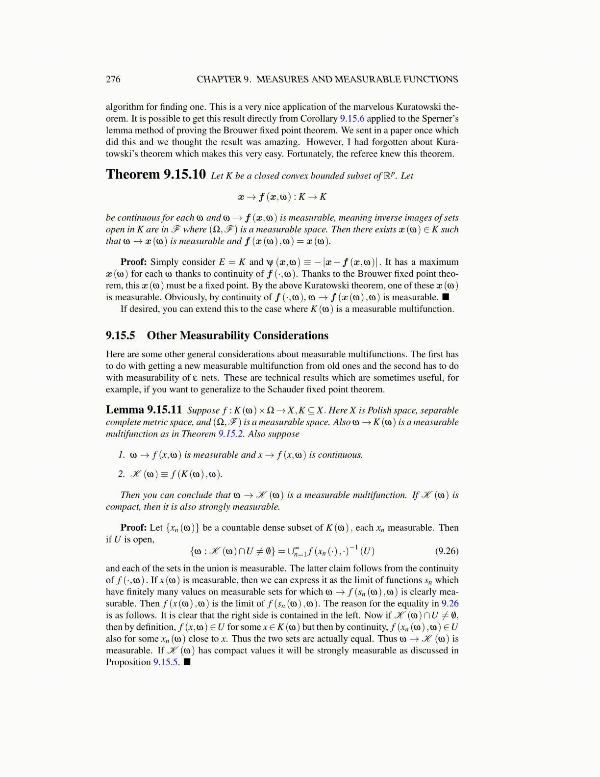 Proof: Simply consider E = K and ψ (x,ω) ≡ −|x−f (x,ω)| . It has a maximumx(ω) for each ω thanks to continuity of f (·,ω). Thanks to the Brouwer fixed point theo-rem, this x(ω) must be a fixed point. By the above Kuratowski theorem, one of these x(ω)is measurable. Obviously, by continuity of f (·,ω), ω → f (x(ω) ,ω) is measurable. ■