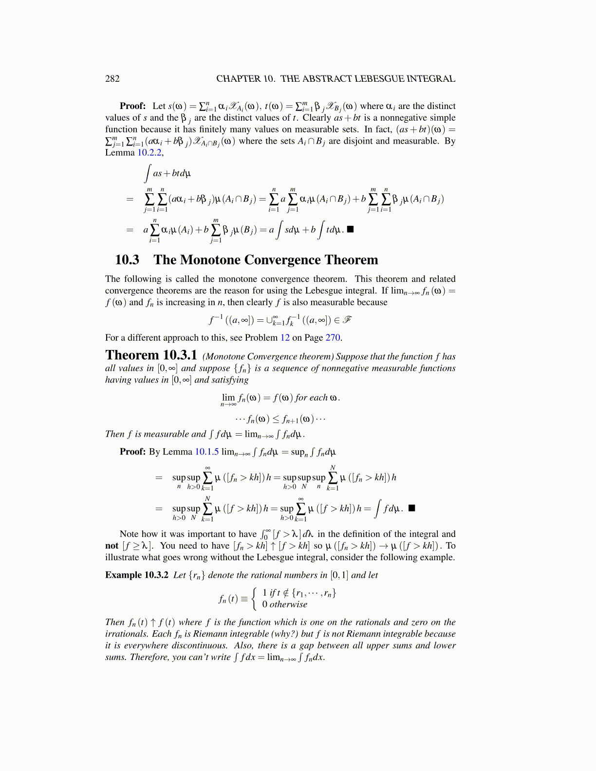 10.3 The Monotone Convergence TheoremThe following is called the monotone convergence theorem. This theorem and relatedconvergence theorems are the reason for using the Lebesgue integral. If limn→∞ fn (ω) =f (ω) and fn is increasing in n, then clearly f is also measurable because