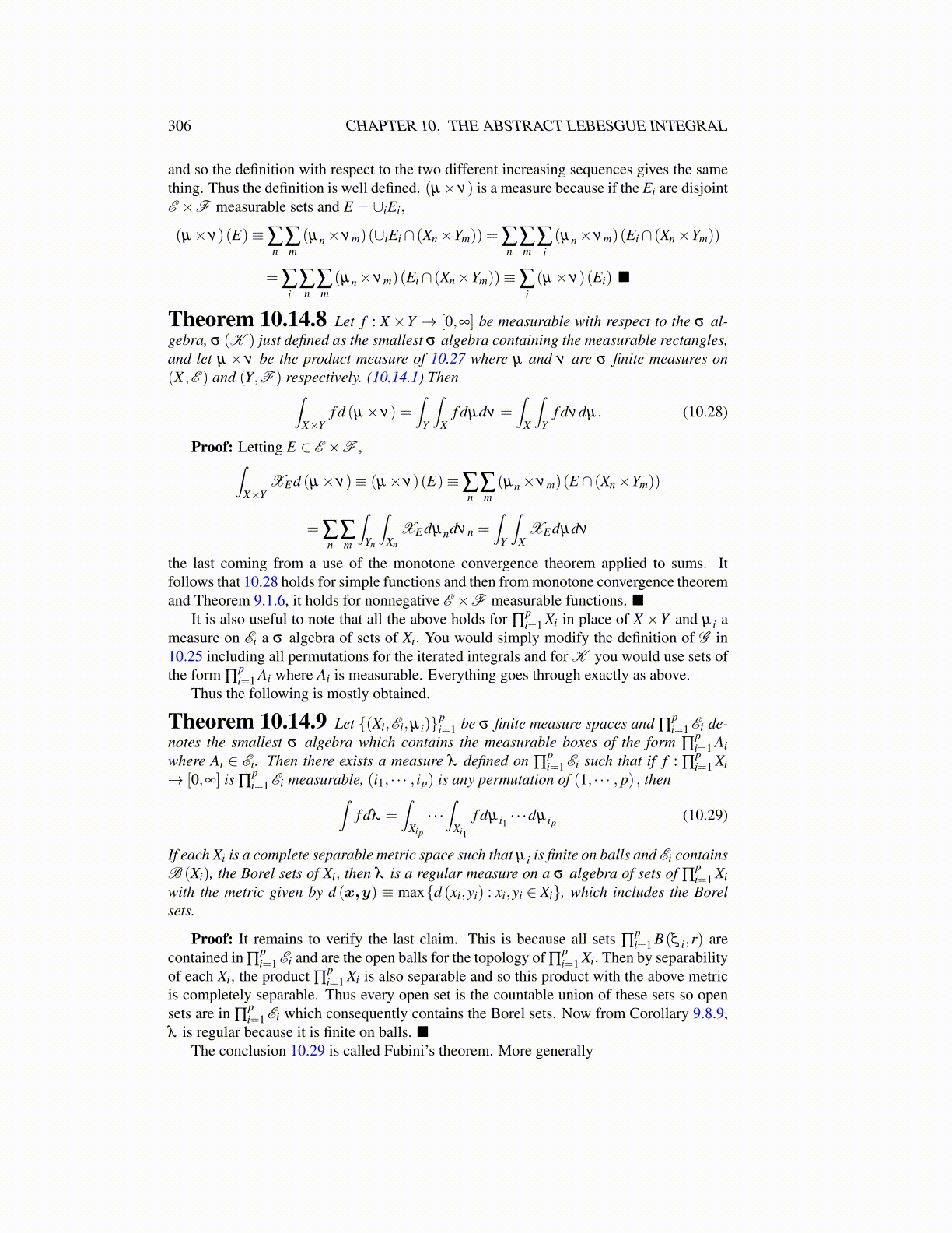 Theorem 10.14.8 Let f : X ×Y → [0,∞] be measurable with respect to the σ al-gebra, σ (K ) just defined as the smallest σ algebra containing the measurable rectangles,and let µ × ν be the product measure of 10.27 where µ and ν are σ finite measures on(X ,E ) and (Y,F ) respectively. (10.14.1) Then∫