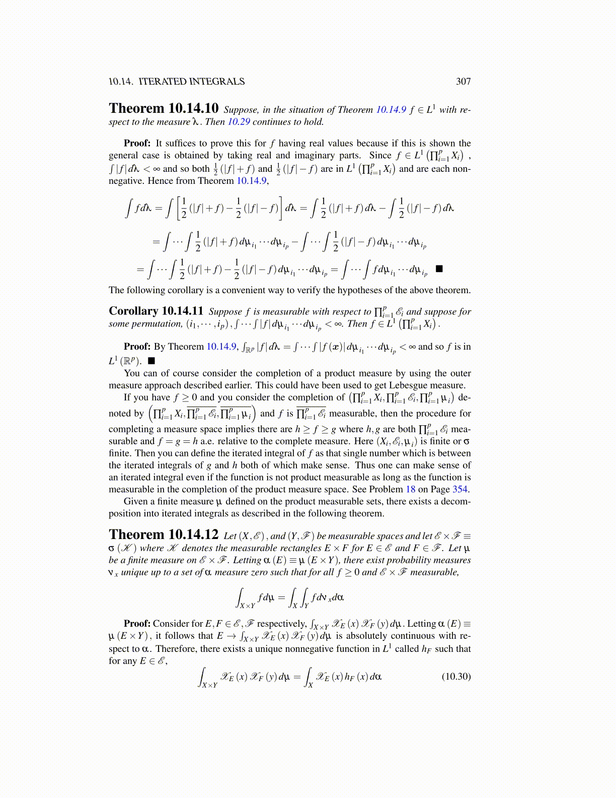 finite. Then you can define the iterated integral of f as that single number which is betweenthe iterated integrals of g and h both of which make sense. Thus one can make sense ofan iterated integral even if the function is not product measurable as long as the function ismeasurable in the completion of the product measure space. See Problem 18 on Page 354.