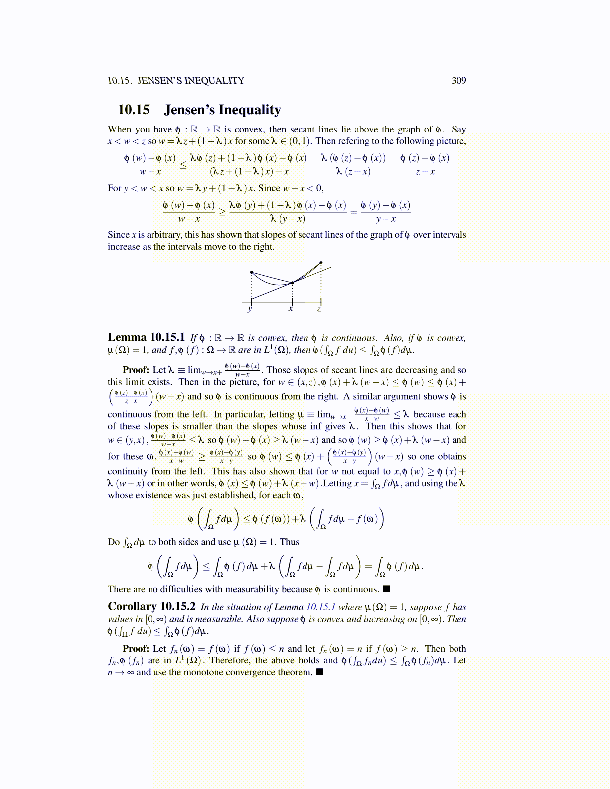 Lemma 10.15.1 If φ : R→ R is convex, then φ is continuous. Also, if φ is convex,µ(Ω) = 1, and f ,φ ( f ) : Ω→ R are in L1(Ω), then φ(