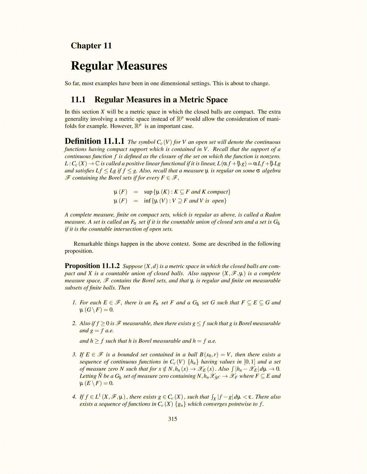 Definition 11.1.1 The symbol Cc (V ) for V an open set will denote the continuousfunctions having compact support which is contained in V . Recall that the support of acontinuous function f is defined as the closure of the set on which the function is nonzero.L : Cc (X)→C is called a positive linear functional if it is linear, L(α f +βg)=αL f +βLgand satisfies L f ≤ Lg if f ≤ g. Also, recall that a measure µ is regular on some σ algebraF containing the Borel sets if for every F ∈F ,