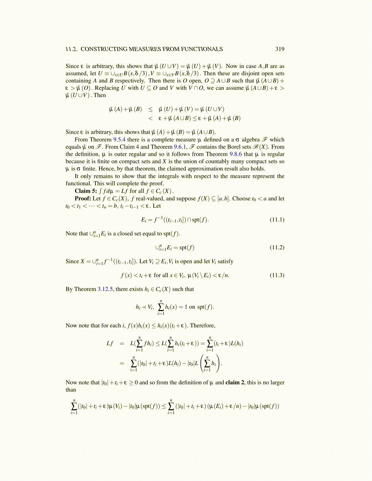 equals µ̄ on F . From Claim 4 and Theorem 9.6.1, F contains the Borel sets B (X). Fromthe definition, µ is outer regular and so it follows from Theorem 9.8.6 that µ is regularbecause it is finite on compact sets and X is the union of countably many compact sets soµ is σ finite. Hence, by that theorem, the claimed approximation result also holds.