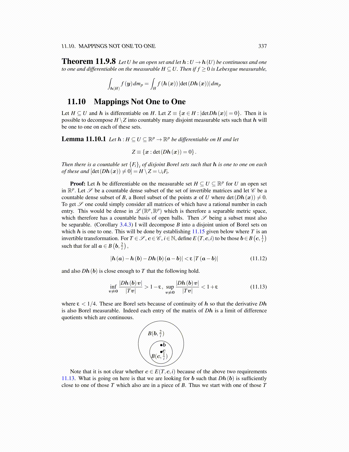 11.10 Mappings Not One to OneLet H ⊆U and h is differentiable on H. Let Z ≡ {x ∈ H : |detDh(x)|= 0}. Then it ispossible to decompose H \Z into countably many disjoint measurable sets such that h willbe one to one on each of these sets.