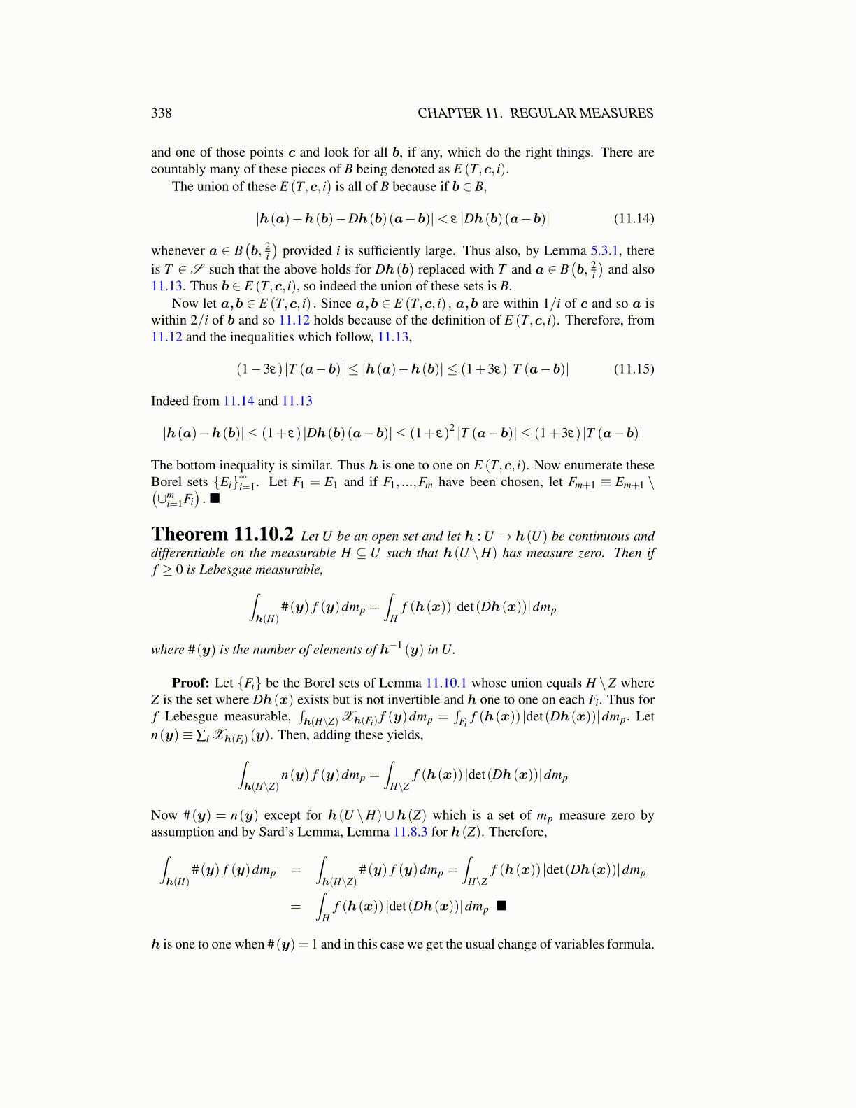 Theorem 11.10.2 Let U be an open set and let h : U → h(U) be continuous anddifferentiable on the measurable H ⊆ U such that h(U \H) has measure zero. Then iff ≥ 0 is Lebesgue measurable,∫