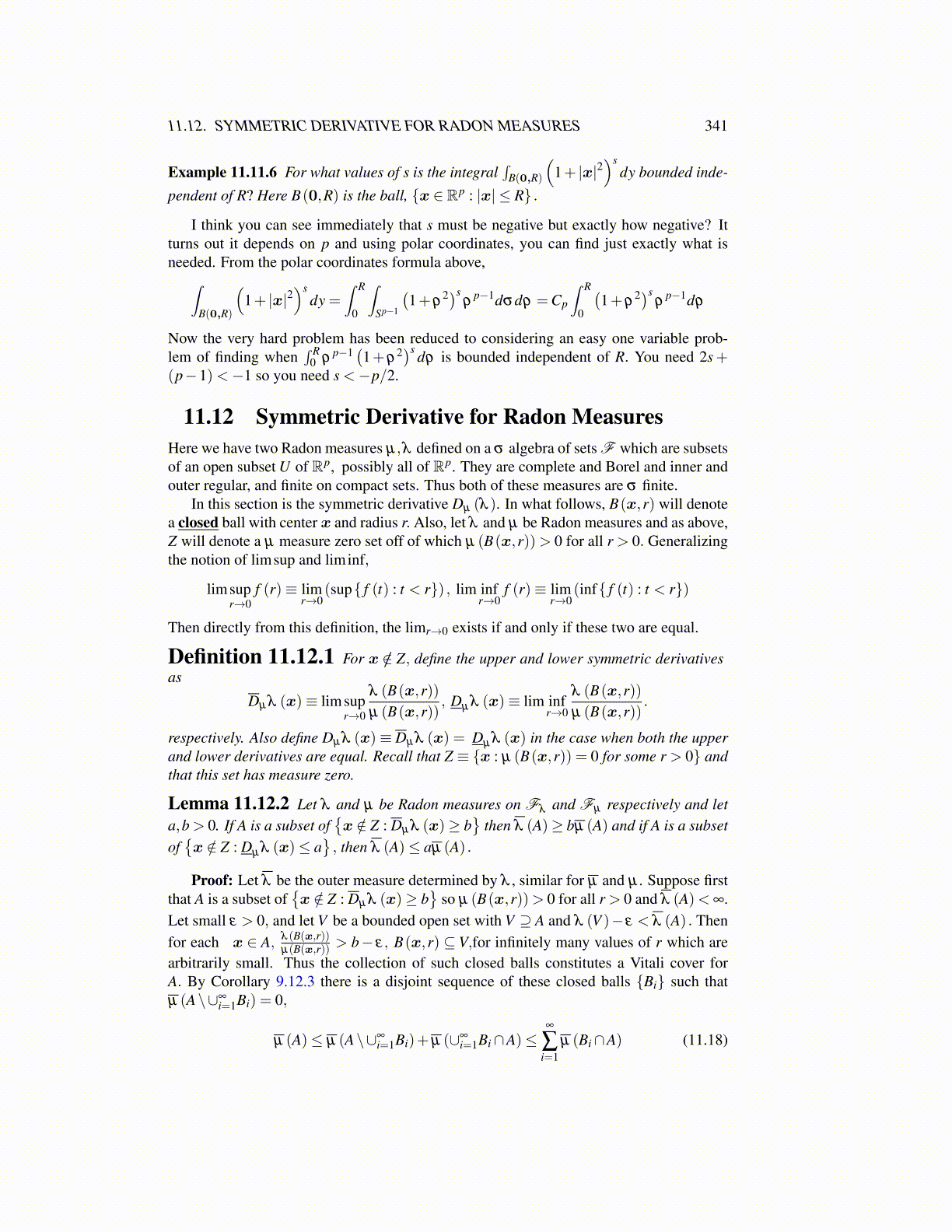 11.12 Symmetric Derivative for Radon MeasuresHere we have two Radon measures µ,λ defined on a σ algebra of sets F which are subsetsof an open subset U of Rp, possibly all of Rp. They are complete and Borel and inner andouter regular, and finite on compact sets. Thus both of these measures are σ finite.