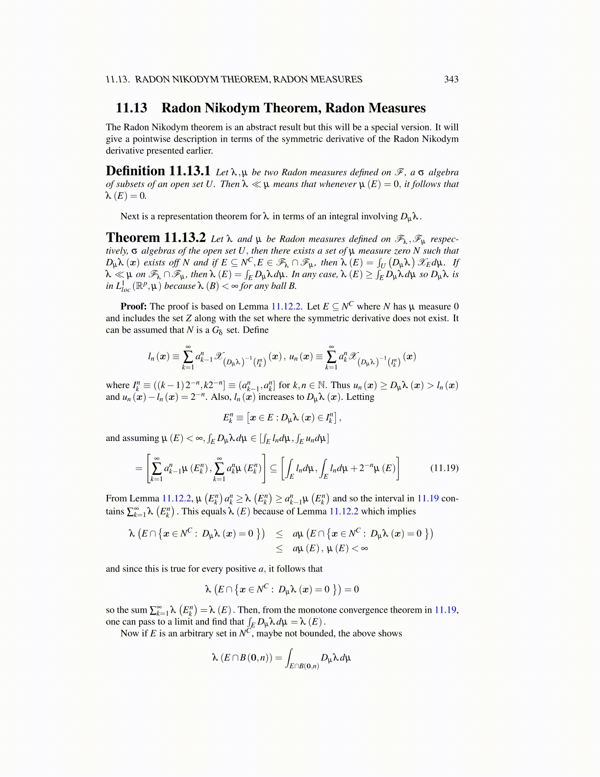 11.13 Radon Nikodym Theorem, Radon MeasuresThe Radon Nikodym theorem is an abstract result but this will be a special version. It willgive a pointwise description in terms of the symmetric derivative of the Radon Nikodymderivative presented earlier.