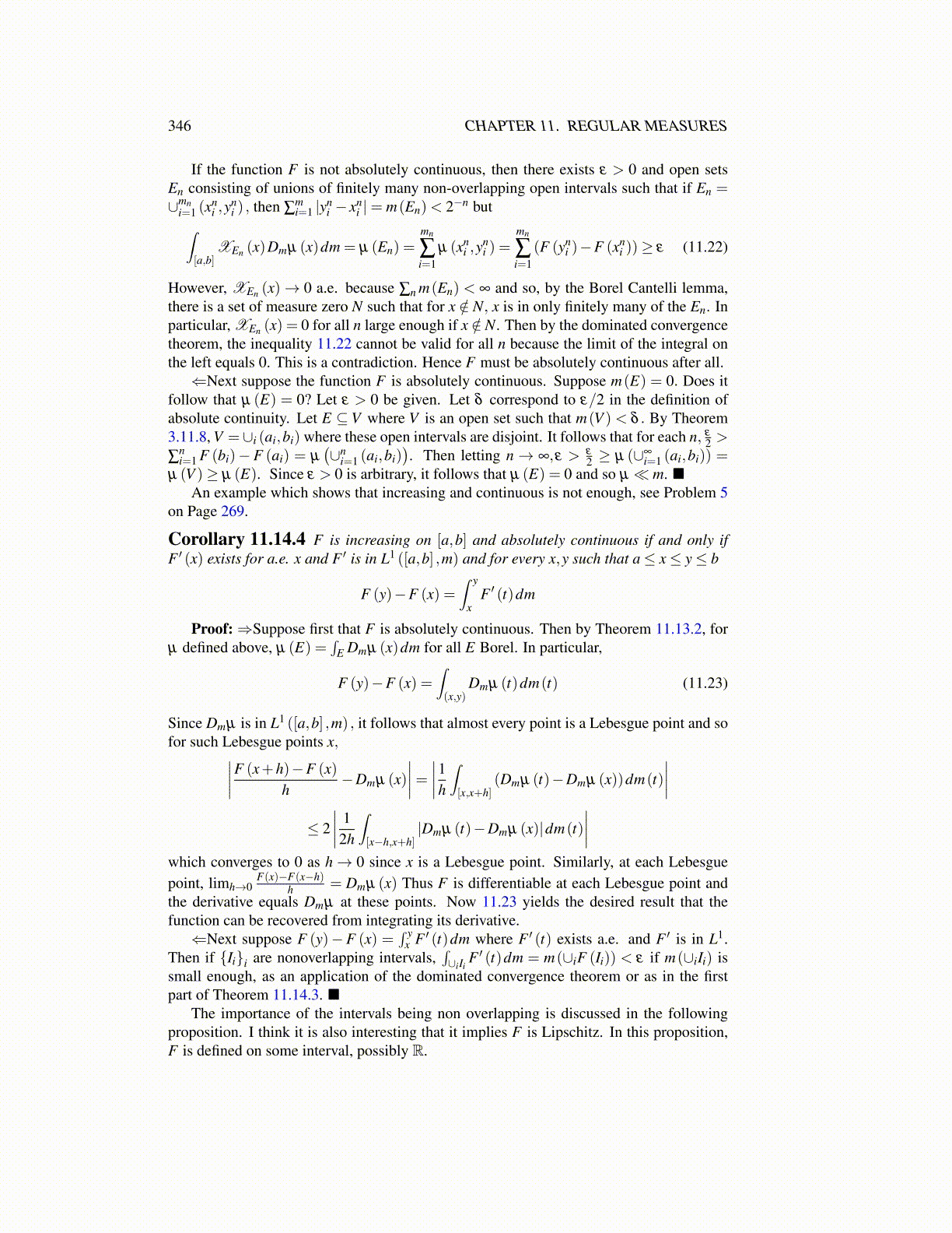 However, XEn (x)→ 0 a.e. because ∑n m(En) < ∞ and so, by the Borel Cantelli lemma,there is a set of measure zero N such that for x /∈ N, x is in only finitely many of the En. Inparticular, XEn (x) = 0 for all n large enough if x /∈ N. Then by the dominated convergencetheorem, the inequality 11.22 cannot be valid for all n because the limit of the integral onthe left equals 0. This is a contradiction. Hence F must be absolutely continuous after all.⇐Next suppose the function F is absolutely continuous. Suppose m(E) = 0. Does it
