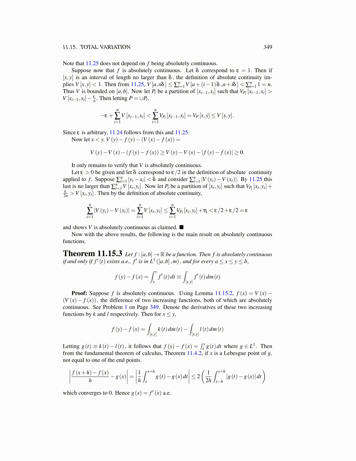 Proof: Suppose f is absolutely continuous. Using Lemma 11.15.2, f (x) = V (x)−(V (x)− f (x)) , the difference of two increasing functions, both of which are absolutelycontinuous. See Problem 1 on Page 349. Denote the derivatives of these two increasingfunctions by k and l respectively. Then for x≤ y,