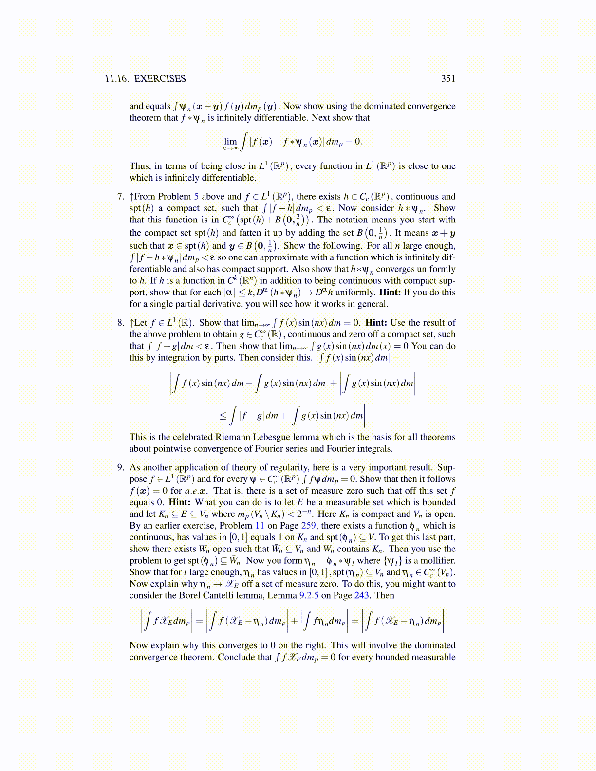 | f −h∗ψn|dmp < ε so one can approximate with a function which is infinitely dif-ferentiable and also has compact support. Also show that h∗ψn converges uniformlyto h. If h is a function in Ck (Rn) in addition to being continuous with compact sup-port, show that for each |α| ≤ k,Dα (h∗ψn)→ Dα h uniformly. Hint: If you do thisfor a single partial derivative, you will see how it works in general.