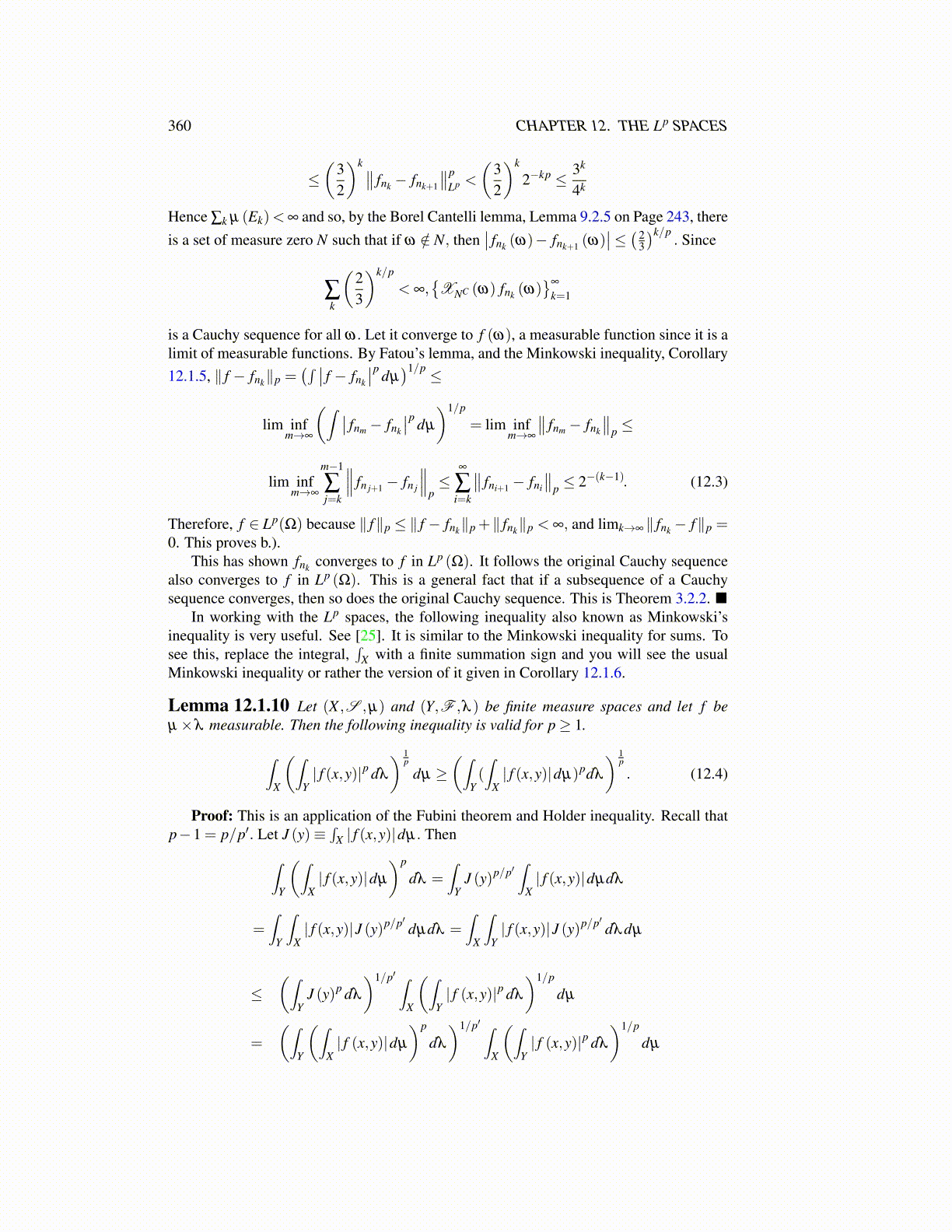 is a Cauchy sequence for all ω. Let it converge to f (ω), a measurable function since it is alimit of measurable functions. By Fatou’s lemma, and the Minkowski inequality, Corollary12.1.5, ∥ f − fnk∥p =