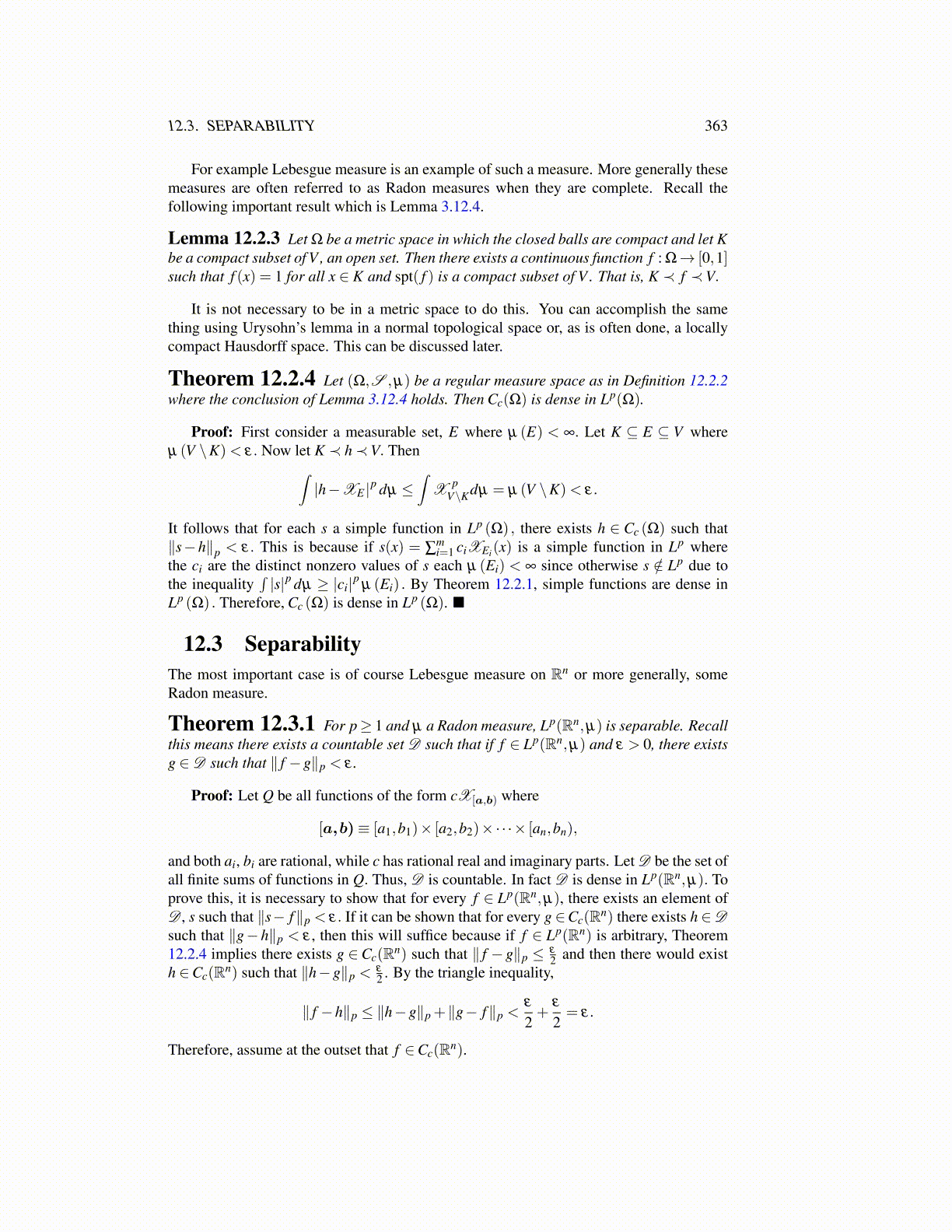 Theorem 12.3.1 For p≥ 1 and µ a Radon measure, Lp(Rn,µ) is separable. Recallthis means there exists a countable set D such that if f ∈ Lp(Rn,µ) and ε > 0, there existsg ∈D such that ∥ f −g∥p < ε .