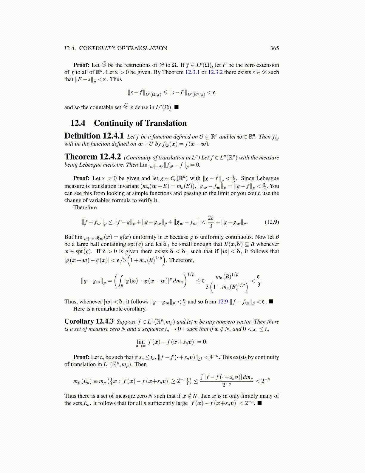 Theorem 12.4.2 (Continuity of translation in Lp) Let f ∈ Lp(Rn) with the measurebeing Lebesgue measure. Then lim∥w∥→0 ∥ fw− f∥p = 0.