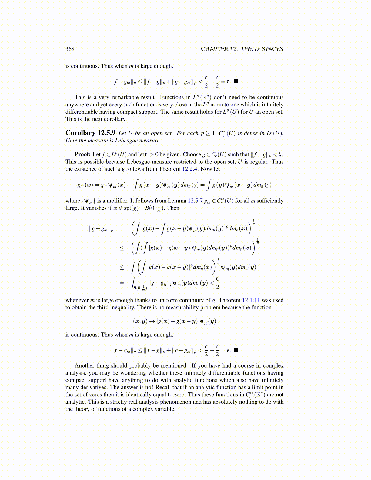 Corollary 12.5.9 Let U be an open set. For each p ≥ 1, C∞c (U) is dense in Lp(U).