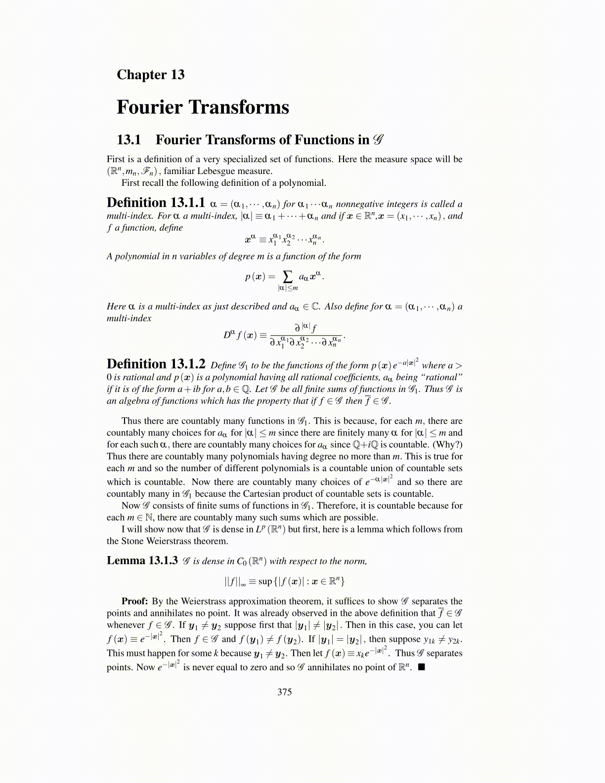 Definition 13.1.2 Define G1 to be the functions of the form p(x)e−a|x|2 where a >0 is rational and p(x) is a polynomial having all rational coefficients, aα being “rational”if it is of the form a+ ib for a,b ∈Q. Let G be all finite sums of functions in G1. Thus G isan algebra of functions which has the property that if f ∈ G then f ∈ G .