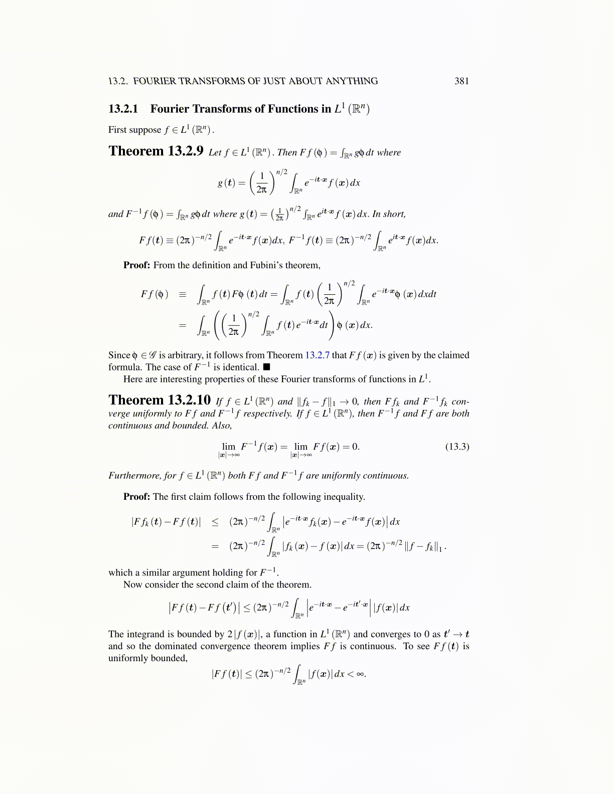 Theorem 13.2.10 If f ∈ L1 (Rn) and ∥ fk − f∥1 → 0, then F fk and F−1 fk con-verge uniformly to F f and F−1 f respectively. If f ∈ L1 (Rn), then F−1 f and F f are bothcontinuous and bounded. Also,