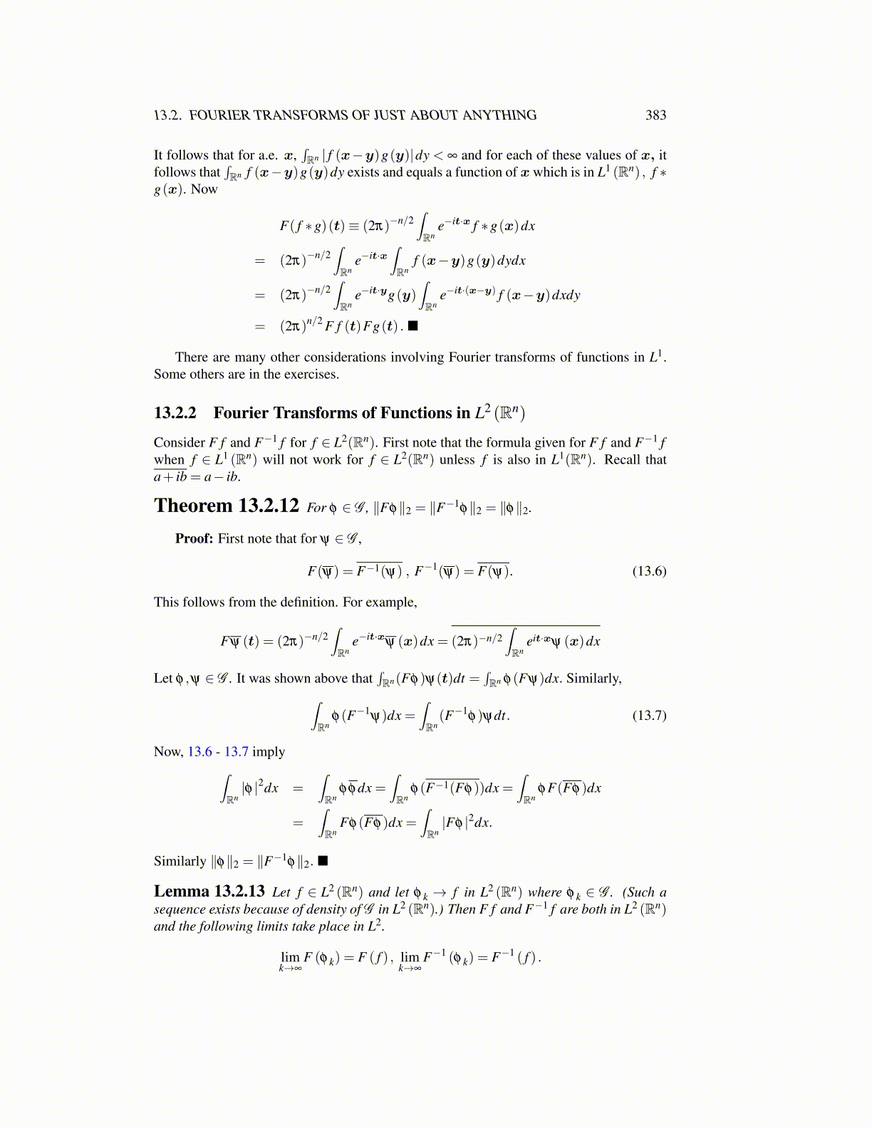 Lemma 13.2.13 Let f ∈ L2 (Rn) and let φ k → f in L2 (Rn) where φ k ∈ G . (Such asequence exists because of density of G in L2 (Rn).) Then F f and F−1 f are both in L2 (Rn)and the following limits take place in L2.