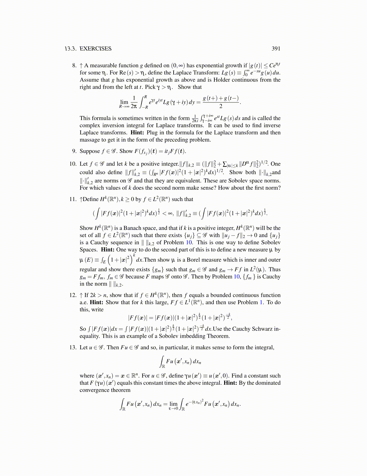 12. ↑ If 2k > n, show that if f ∈ Hk(Rn), then f equals a bounded continuous functiona.e. Hint: Show that for k this large, F f ∈ L1(Rn), and then use Problem 1. To dothis, write