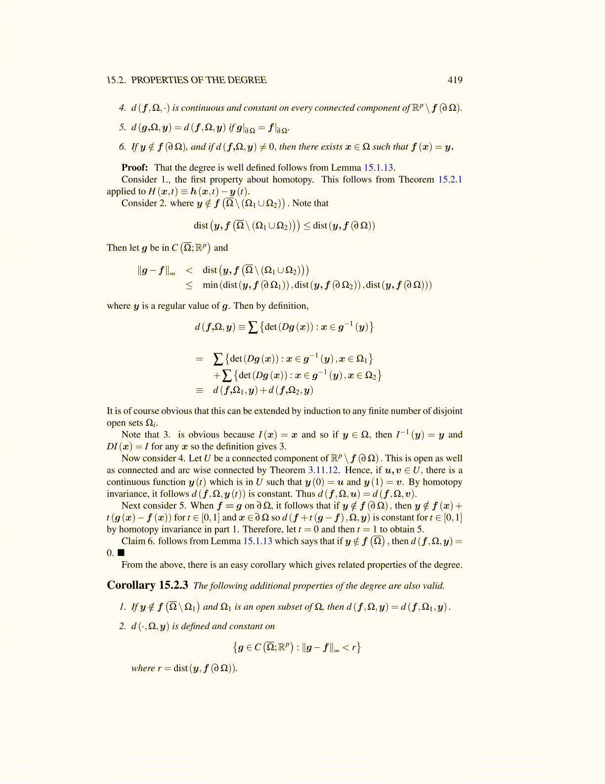 Now consider 4. Let U be a connected component of Rp \f (∂Ω) . This is open as wellas connected and arc wise connected by Theorem 3.11.12. Hence, if u,v ∈U, there is acontinuous function y (t) which is in U such that y (0) = u and y (1) = v. By homotopyinvariance, it follows d (f ,Ω,y (t)) is constant. Thus d (f ,Ω,u) = d (f ,Ω,v).
