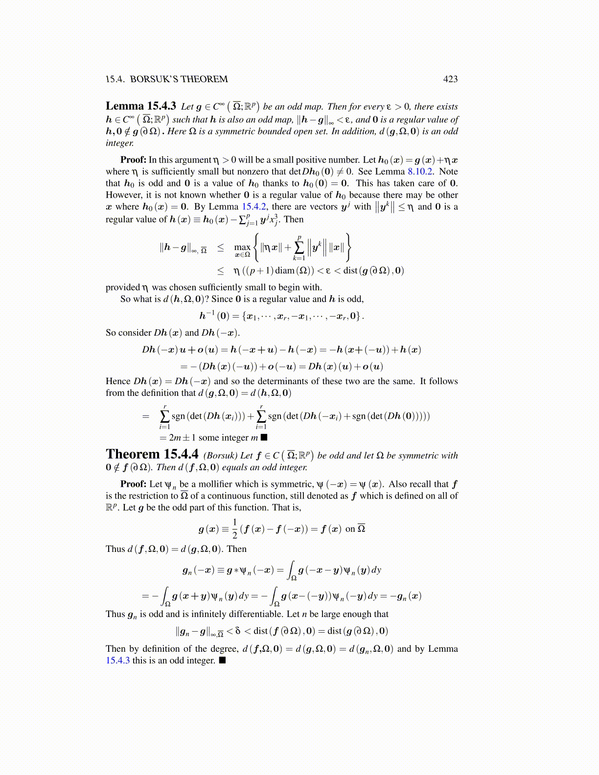 Proof: In this argument η > 0 will be a small positive number. Let h0 (x) = g (x)+ηxwhere η is sufficiently small but nonzero that detDh0 (0) ̸= 0. See Lemma 8.10.2. Notethat h0 is odd and 0 is a value of h0 thanks to h0 (0) = 0. This has taken care of 0.However, it is not known whether 0 is a regular value of h0 because there may be otherx where h0 (x) = 0. By Lemma 15.4.2, there are vectors y j with