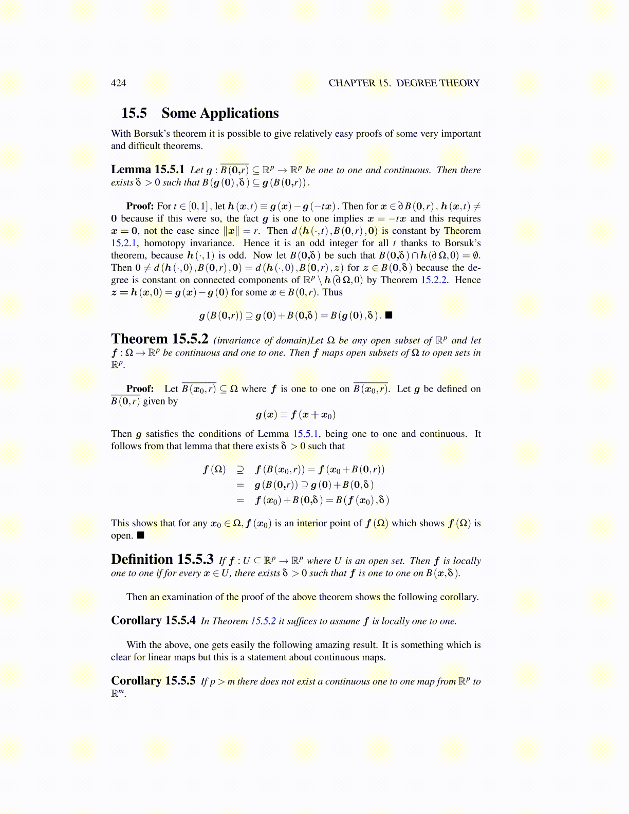 Lemma 15.5.1 Let g : B(0,r) ⊆ Rp → Rp be one to one and continuous. Then thereexists δ > 0 such that B(g (0) ,δ )⊆ g (B(0,r)) .