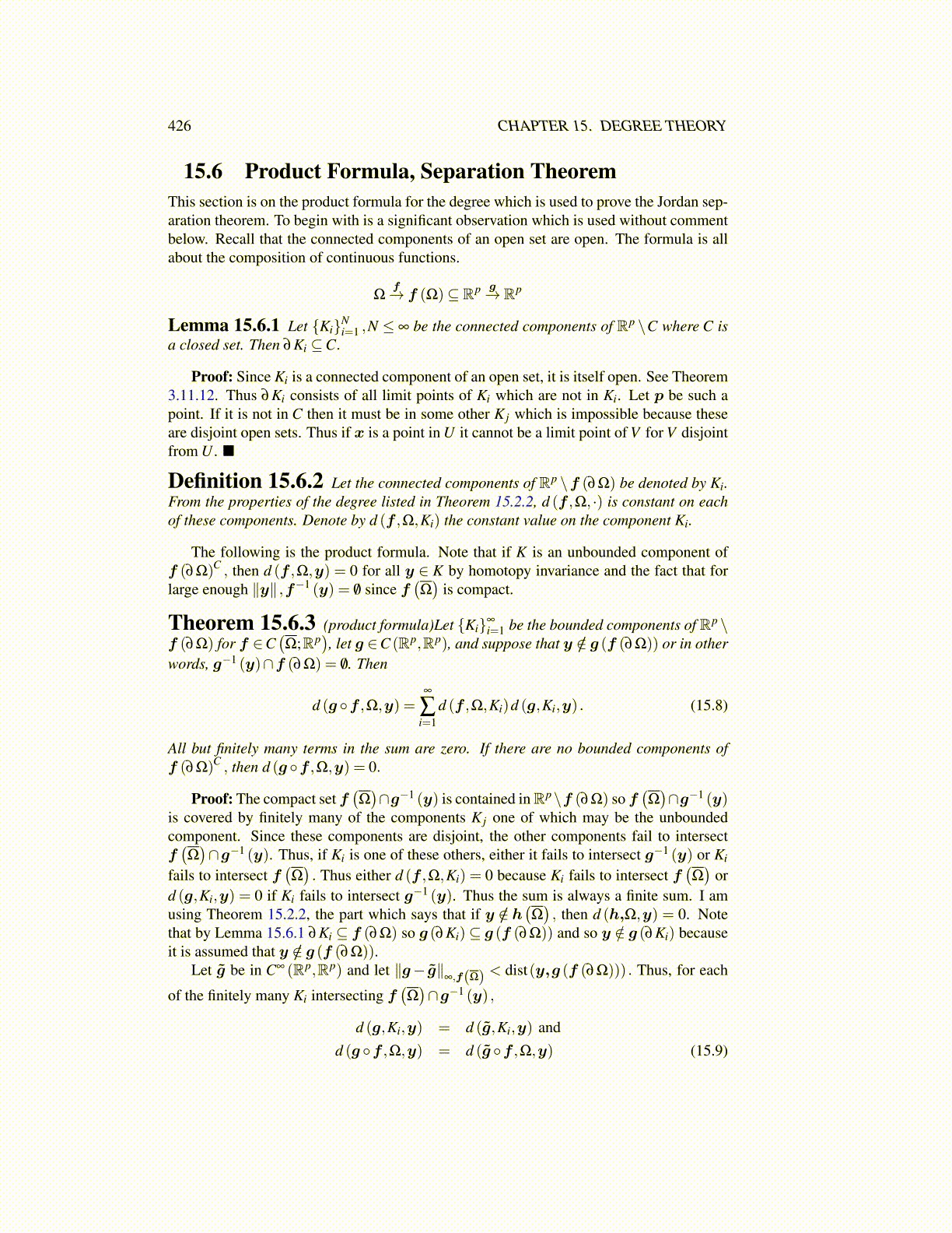 15.6 Product Formula, Separation TheoremThis section is on the product formula for the degree which is used to prove the Jordan sep-aration theorem. To begin with is a significant observation which is used without commentbelow. Recall that the connected components of an open set are open. The formula is allabout the composition of continuous functions.