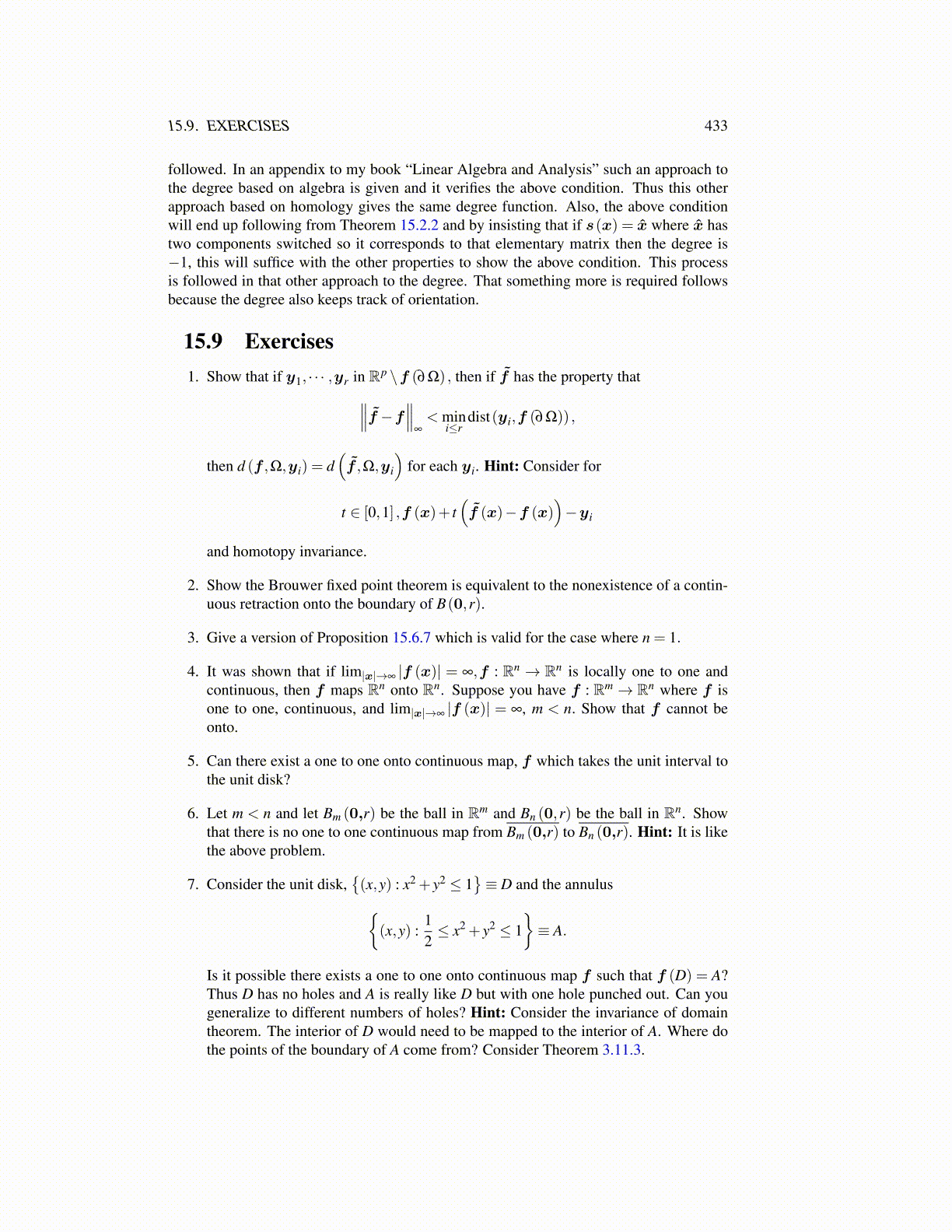 followed. In an appendix to my book “Linear Algebra and Analysis” such an approach tothe degree based on algebra is given and it verifies the above condition. Thus this otherapproach based on homology gives the same degree function. Also, the above conditionwill end up following from Theorem 15.2.2 and by insisting that if s(x) = x̂ where x̂ hastwo components switched so it corresponds to that elementary matrix then the degree is−1, this will suffice with the other properties to show the above condition. This processis followed in that other approach to the degree. That something more is required followsbecause the degree also keeps track of orientation.