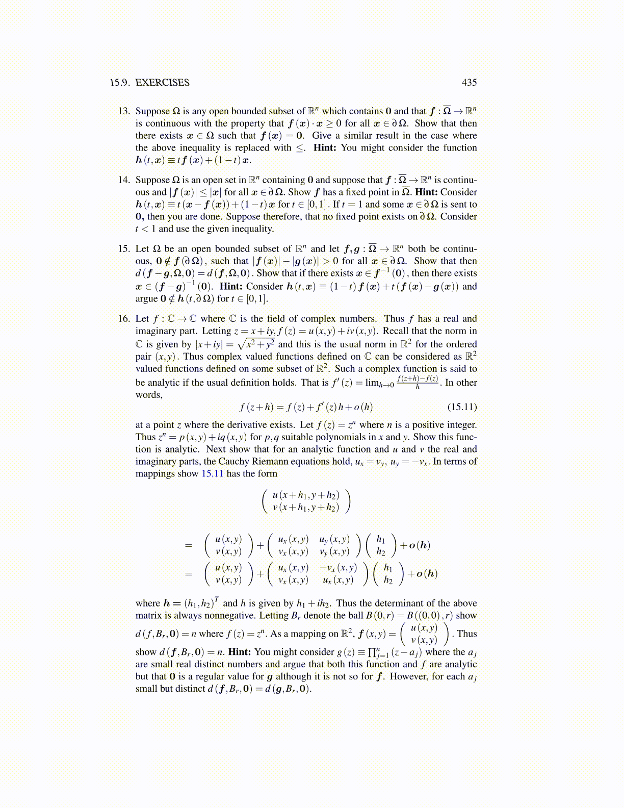 15. Let Ω be an open bounded subset of Rn and let f,g : Ω→ Rn both be continu-ous, 0 /∈ f (∂Ω) , such that |f (x)| − |g (x)| > 0 for all x ∈ ∂Ω. Show that thend (f −g,Ω,0) = d (f ,Ω,0) . Show that if there exists x ∈ f−1 (0) , then there existsx ∈ (f −g)−1 (0). Hint: Consider h(t,x) ≡ (1− t)f (x)+ t (f (x)−g (x)) andargue 0 /∈ h(t,∂Ω) for t ∈ [0,1].