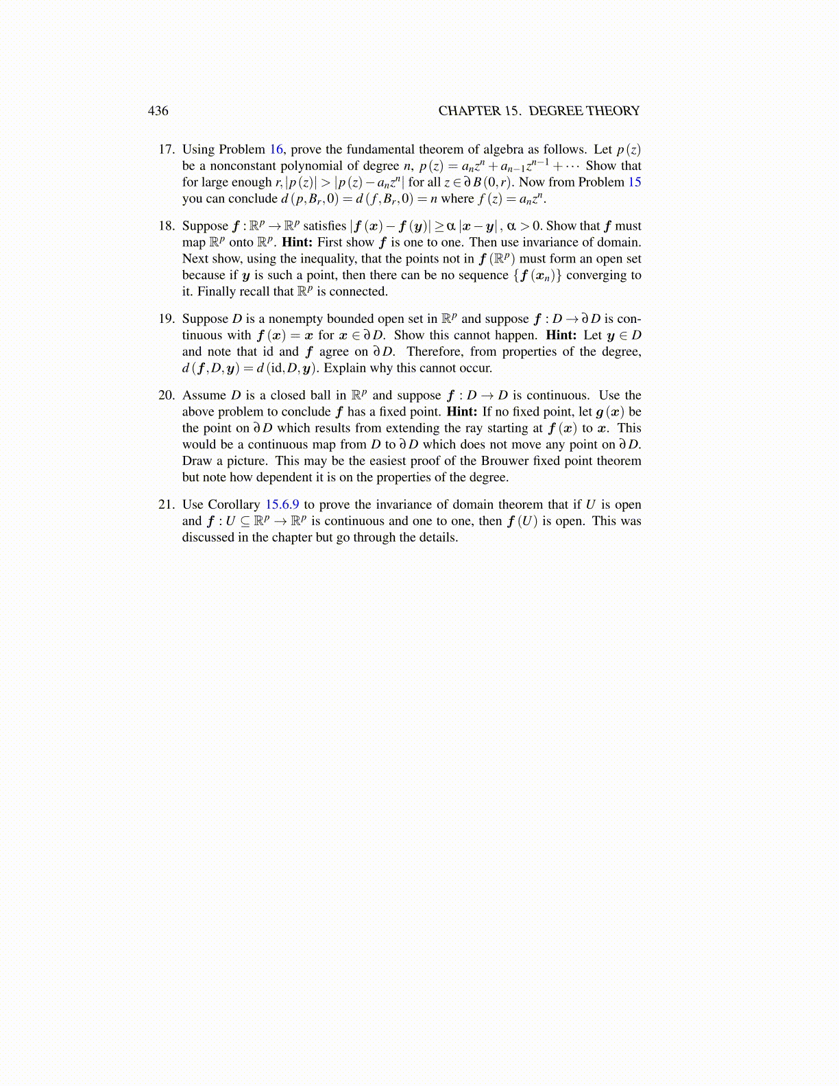 17. Using Problem 16, prove the fundamental theorem of algebra as follows. Let p(z)be a nonconstant polynomial of degree n, p(z) = anzn + an−1zn−1 + · · · Show thatfor large enough r, |p(z)|> |p(z)−anzn| for all z ∈ ∂B(0,r). Now from Problem 15you can conclude d (p,Br,0) = d ( f ,Br,0) = n where f (z) = anzn.