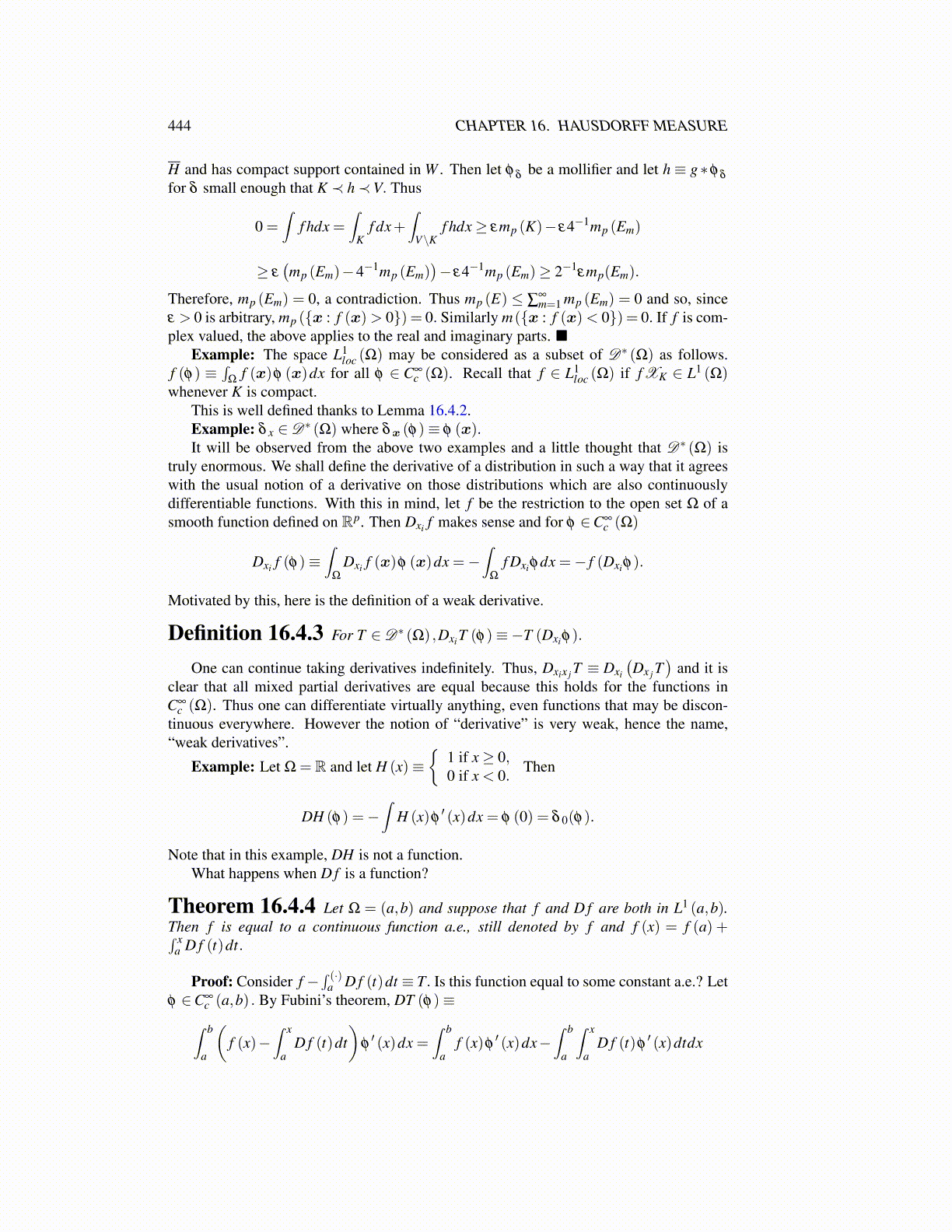 Theorem 16.4.4 Let Ω = (a,b) and suppose that f and D f are both in L1 (a,b).Then f is equal to a continuous function a.e., still denoted by f and f (x) = f (a) +∫ x