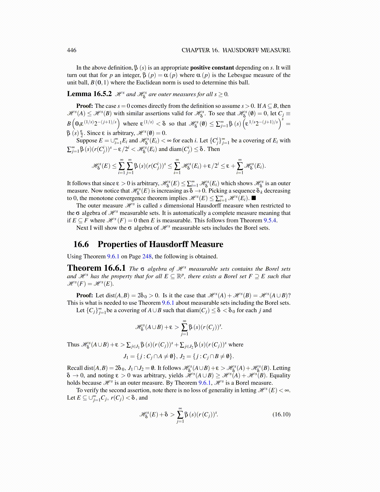 16.6 Properties of Hausdorff MeasureUsing Theorem 9.6.1 on Page 248, the following is obtained.