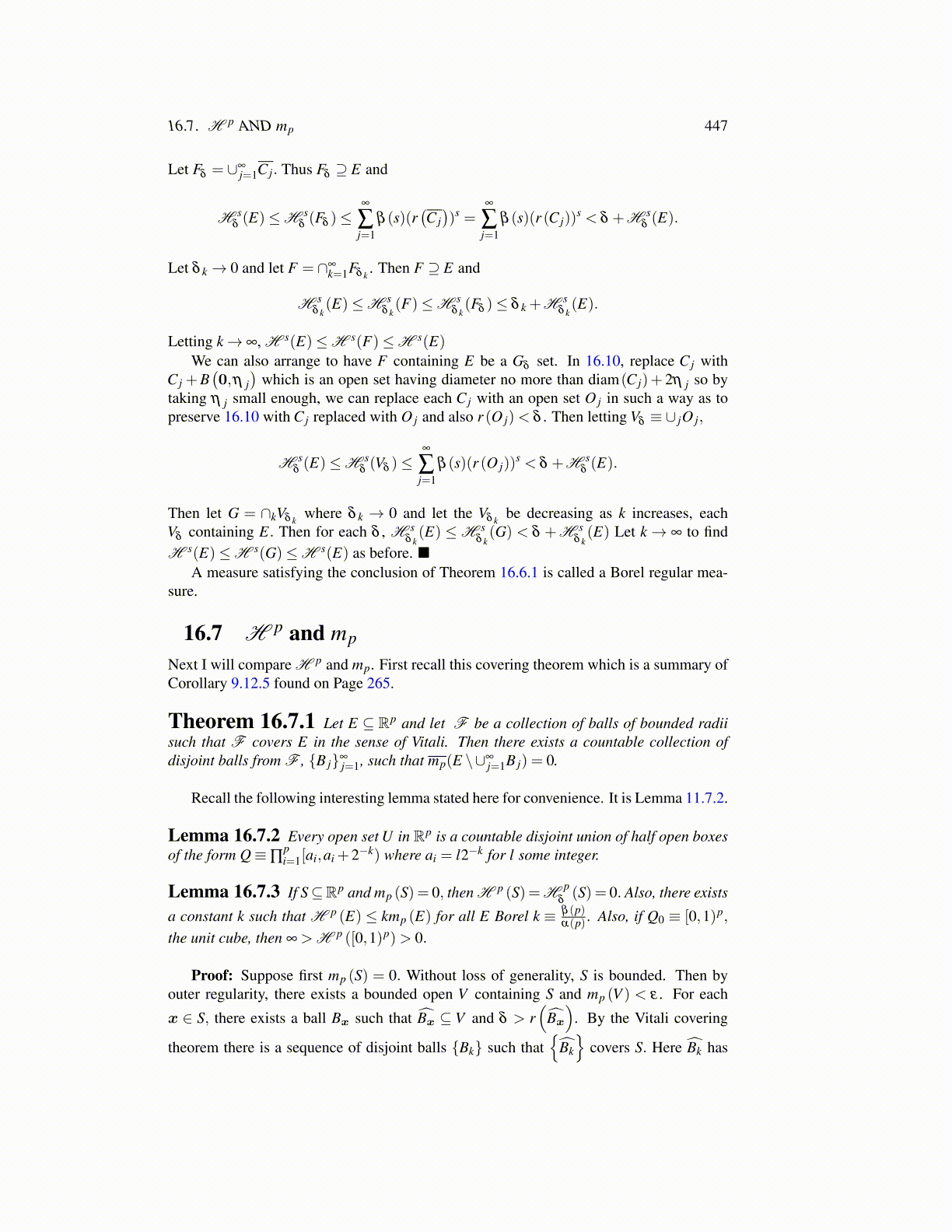 Lemma 16.7.3 If S⊆Rp and mp (S) = 0, then H p (S) =H pδ(S) = 0. Also, there exists