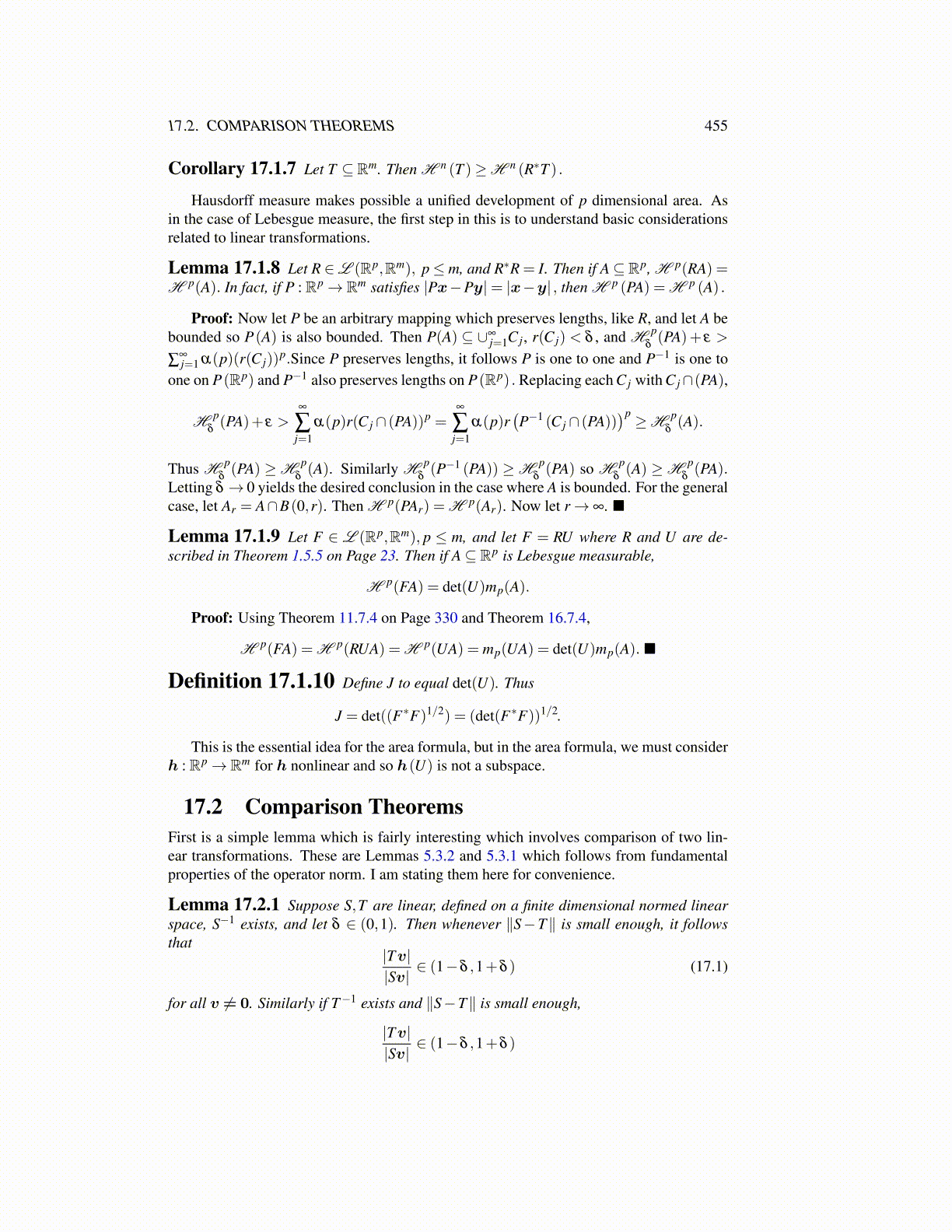Lemma 17.1.9 Let F ∈ L (Rp,Rm), p ≤ m, and let F = RU where R and U are de-scribed in Theorem 1.5.5 on Page 23. Then if A⊆ Rp is Lebesgue measurable,
