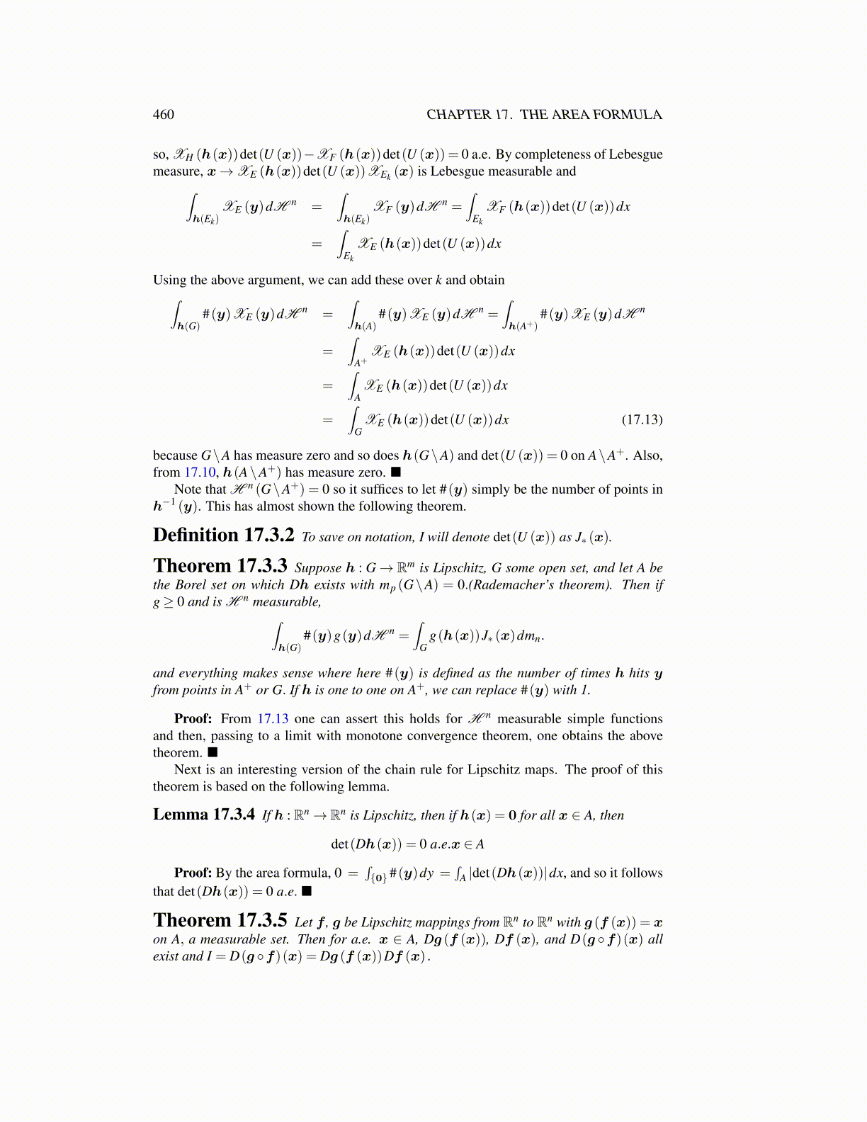 Theorem 17.3.3 Suppose h : G→ Rm is Lipschitz, G some open set, and let A bethe Borel set on which Dh exists with mp (G\A) = 0.(Rademacher’s theorem). Then ifg≥ 0 and is H n measurable,∫