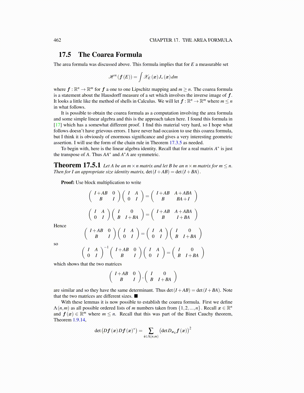 It is possible to obtain the coarea formula as a computation involving the area formulaand some simple linear algebra and this is the approach taken here. I found this formula in[17] which has a somewhat different proof. I find this material very hard, so I hope whatfollows doesn’t have grievous errors. I have never had occasion to use this coarea formula,but I think it is obviously of enormous significance and gives a very interesting geometricassertion. I will use the form of the chain rule in Theorem 17.3.5 as needed.