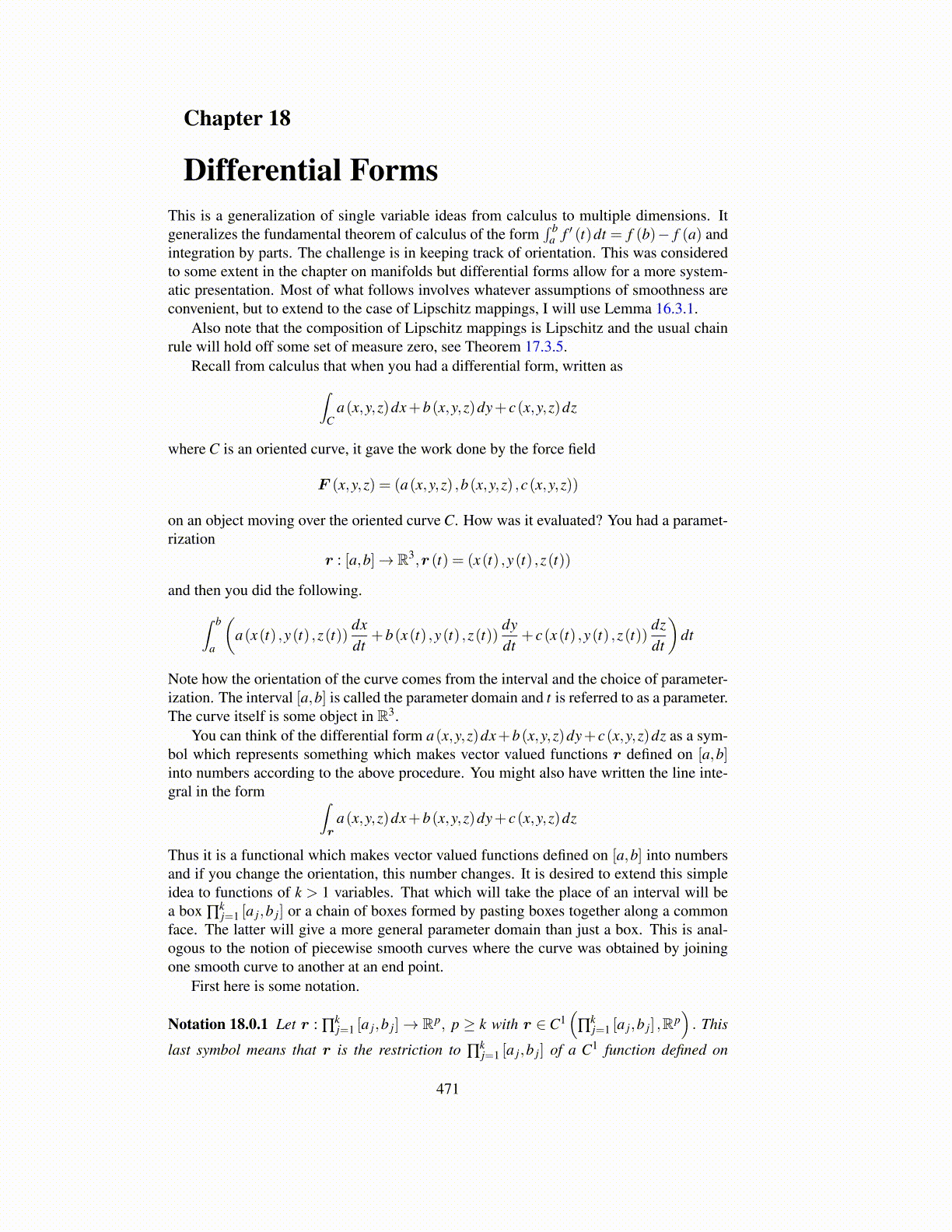integration by parts. The challenge is in keeping track of orientation. This was consideredto some extent in the chapter on manifolds but differential forms allow for a more system-atic presentation. Most of what follows involves whatever assumptions of smoothness areconvenient, but to extend to the case of Lipschitz mappings, I will use Lemma 16.3.1.
