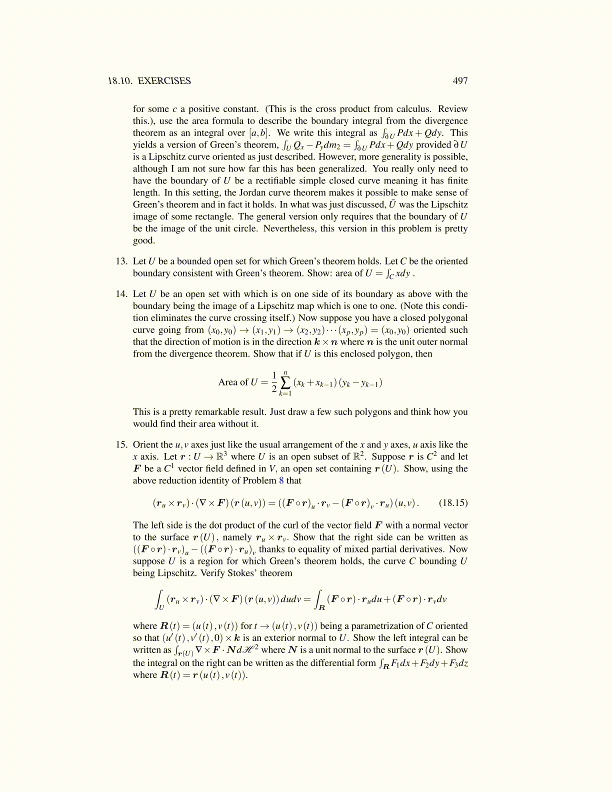 14. Let U be an open set with which is on one side of its boundary as above with theboundary being the image of a Lipschitz map which is one to one. (Note this condi-tion eliminates the curve crossing itself.) Now suppose you have a closed polygonalcurve going from (x0,y0)→ (x1,y1)→ (x2,y2) · · ·(xp,yp) = (x0,y0) oriented suchthat the direction of motion is in the direction k×n where n is the unit outer normalfrom the divergence theorem. Show that if U is this enclosed polygon, then