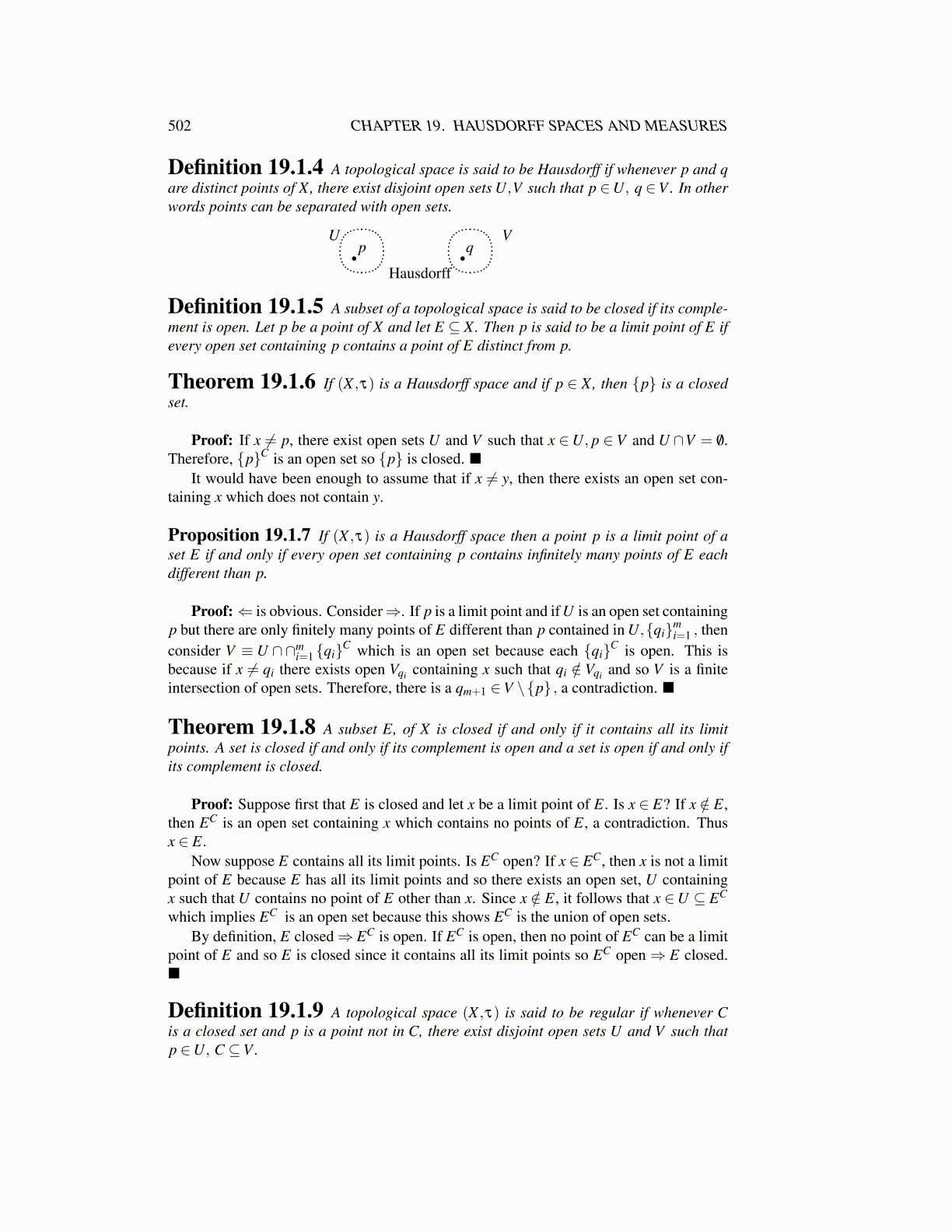 Definition 19.1.4 A topological space is said to be Hausdorff if whenever p and qare distinct points of X, there exist disjoint open sets U,V such that p ∈U, q ∈V . In otherwords points can be separated with open sets.