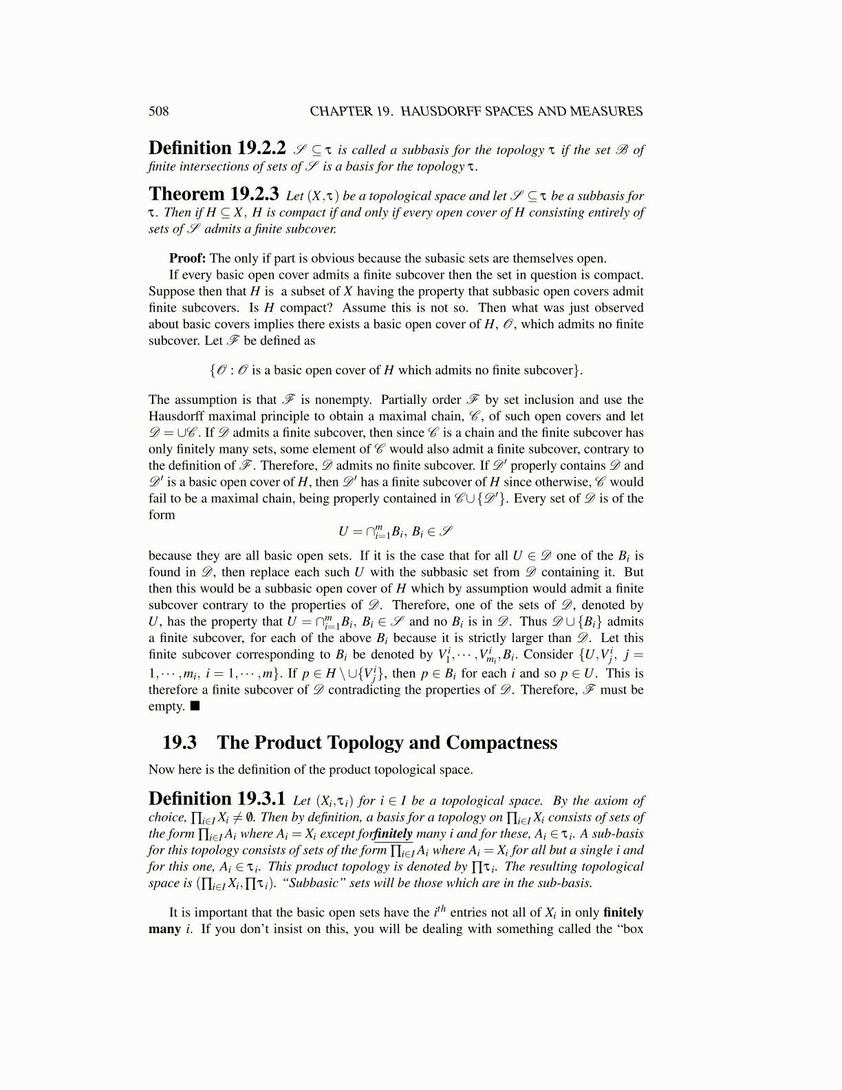 Theorem 19.2.3 Let (X ,τ) be a topological space and let S ⊆ τ be a subbasis forτ . Then if H ⊆ X , H is compact if and only if every open cover of H consisting entirely ofsets of S admits a finite subcover.