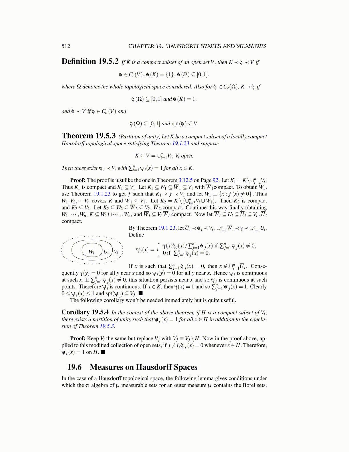 Theorem 19.5.3 (Partition of unity) Let K be a compact subset of a locally compactHausdorff topological space satisfying Theorem 19.1.23 and suppose