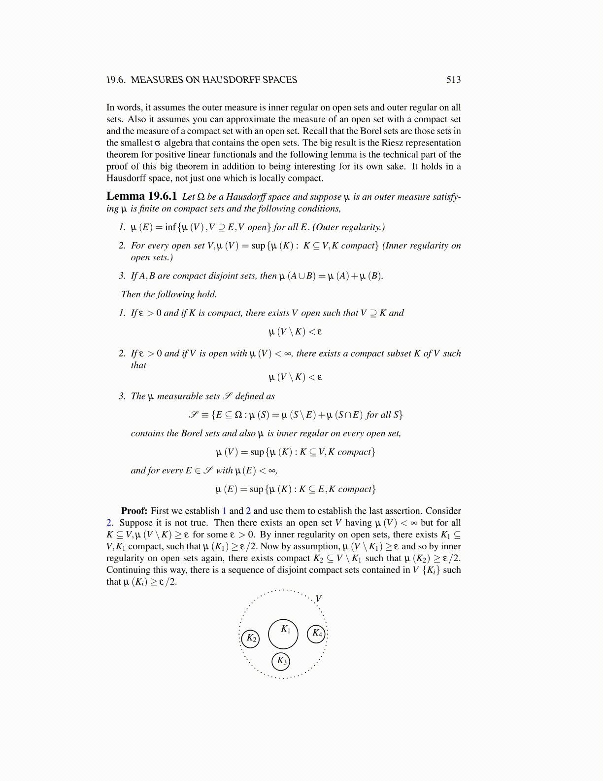 Proof: First we establish 1 and 2 and use them to establish the last assertion. Consider2. Suppose it is not true. Then there exists an open set V having µ (V ) < ∞ but for allK ⊆ V,µ (V \K) ≥ ε for some ε > 0. By inner regularity on open sets, there exists K1 ⊆V,K1 compact, such that µ (K1)≥ ε/2. Now by assumption, µ (V \K1)≥ ε and so by innerregularity on open sets again, there exists compact K2 ⊆ V \K1 such that µ (K2) ≥ ε/2.Continuing this way, there is a sequence of disjoint compact sets contained in V {Ki} suchthat µ (Ki)≥ ε/2.