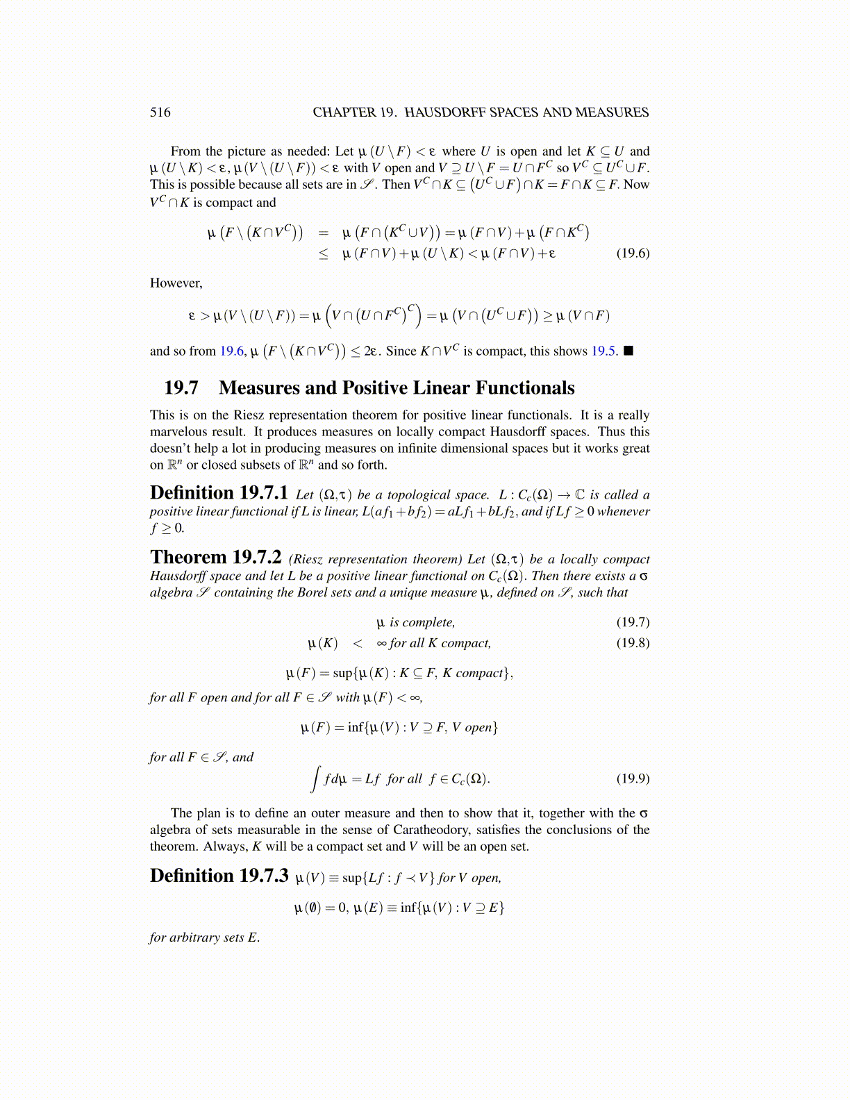 19.7 Measures and Positive Linear FunctionalsThis is on the Riesz representation theorem for positive linear functionals. It is a reallymarvelous result. It produces measures on locally compact Hausdorff spaces. Thus thisdoesn’t help a lot in producing measures on infinite dimensional spaces but it works greaton Rn or closed subsets of Rn and so forth.