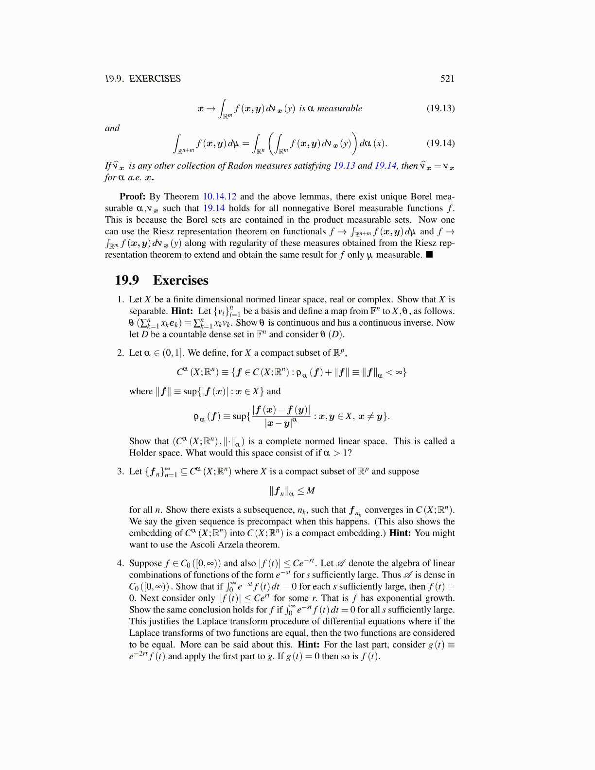 Proof: By Theorem 10.14.12 and the above lemmas, there exist unique Borel mea-surable α,νx such that 19.14 holds for all nonnegative Borel measurable functions f .This is because the Borel sets are contained in the product measurable sets. Now onecan use the Riesz representation theorem on functionals f →