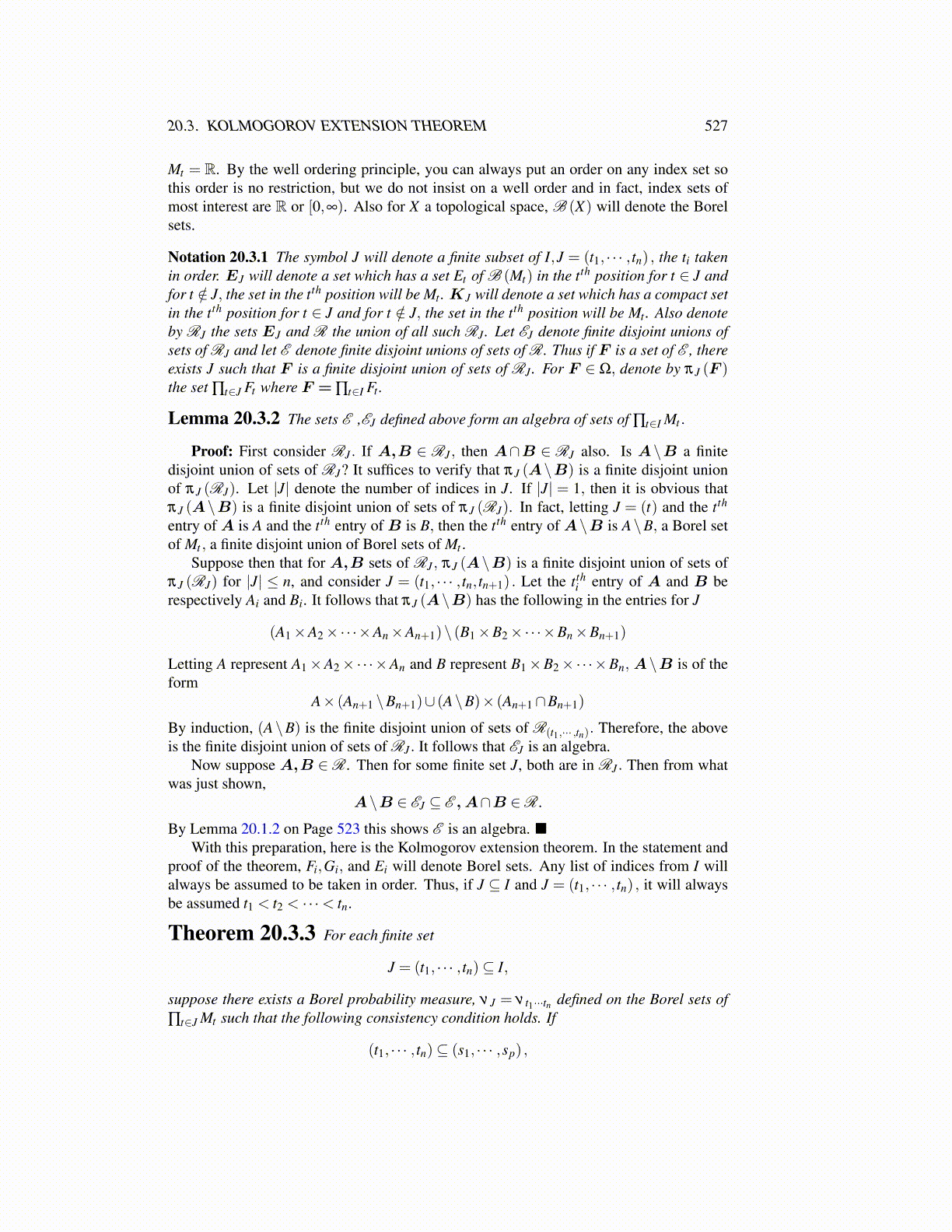Notation 20.3.1 The symbol J will denote a finite subset of I,J = (t1, · · · , tn) , the ti takenin order. EJ will denote a set which has a set Et of B (Mt) in the tth position for t ∈ J andfor t /∈ J, the set in the tth position will be Mt . KJ will denote a set which has a compact setin the tth position for t ∈ J and for t /∈ J, the set in the tth position will be Mt . Also denoteby RJ the sets EJ and R the union of all such RJ . Let EJ denote finite disjoint unions ofsets of RJ and let E denote finite disjoint unions of sets of R. Thus if F is a set of E , thereexists J such that F is a finite disjoint union of sets of RJ . For F ∈ Ω, denote by πJ (F )the set ∏t∈J Ft where F = ∏t∈I Ft .