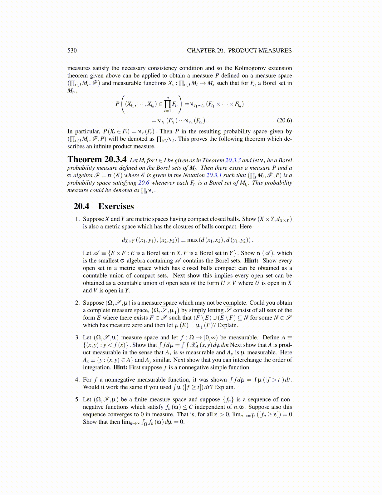 Theorem 20.3.4 Let Mt for t ∈ I be given as in Theorem 20.3.3 and let ν t be a Borelprobability measure defined on the Borel sets of Mt . Then there exists a measure P and aσ algebra F = σ (E ) where E is given in the Notation 20.3.1 such that (∏t Mt ,F ,P) is aprobability space satisfying 20.6 whenever each Fti is a Borel set of Mti . This probabilitymeasure could be denoted as ∏t ν t .