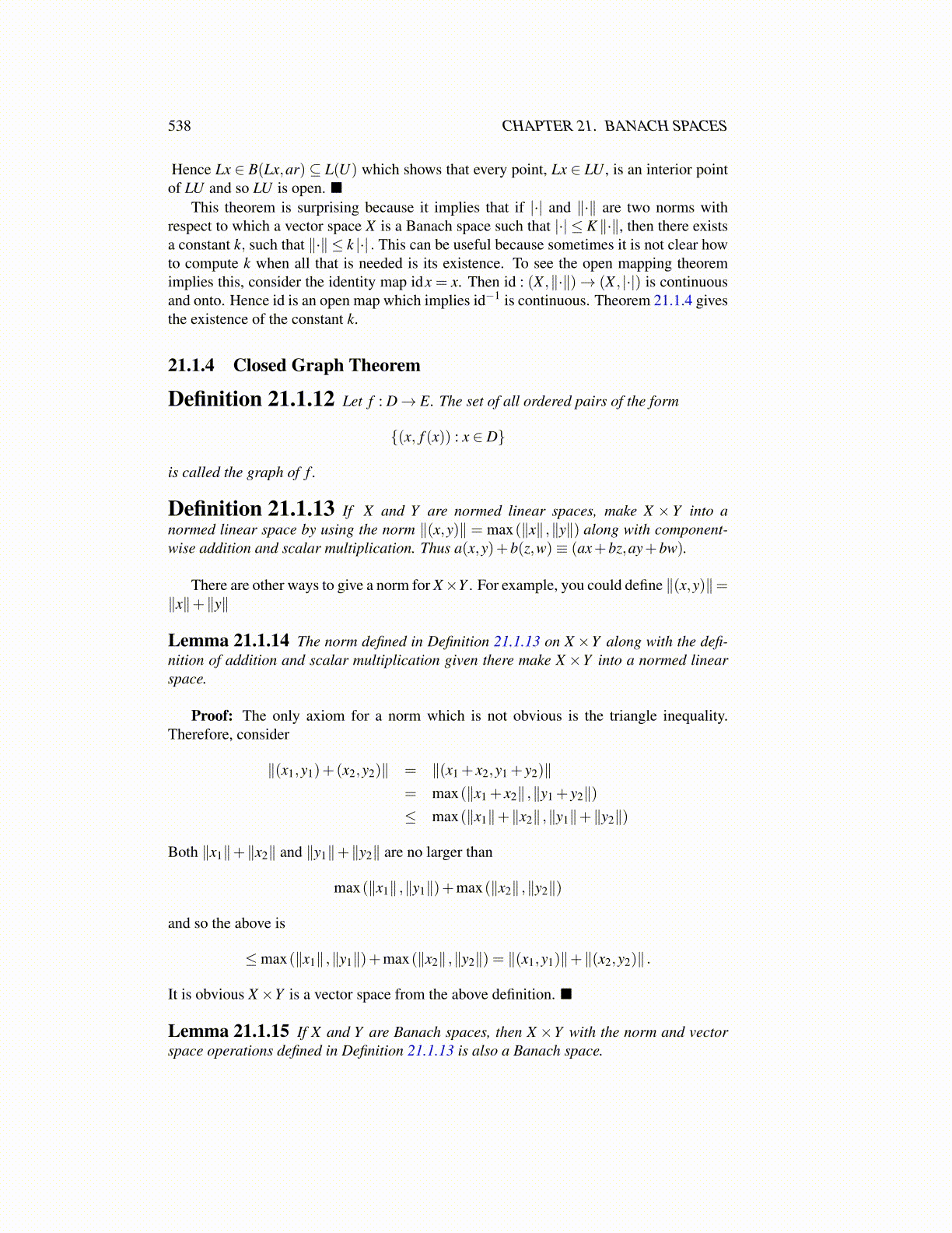 Definition 21.1.13 If X and Y are normed linear spaces, make X ×Y into anormed linear space by using the norm ∥(x,y)∥ = max(∥x∥ ,∥y∥) along with component-wise addition and scalar multiplication. Thus a(x,y)+b(z,w)≡ (ax+bz,ay+bw).