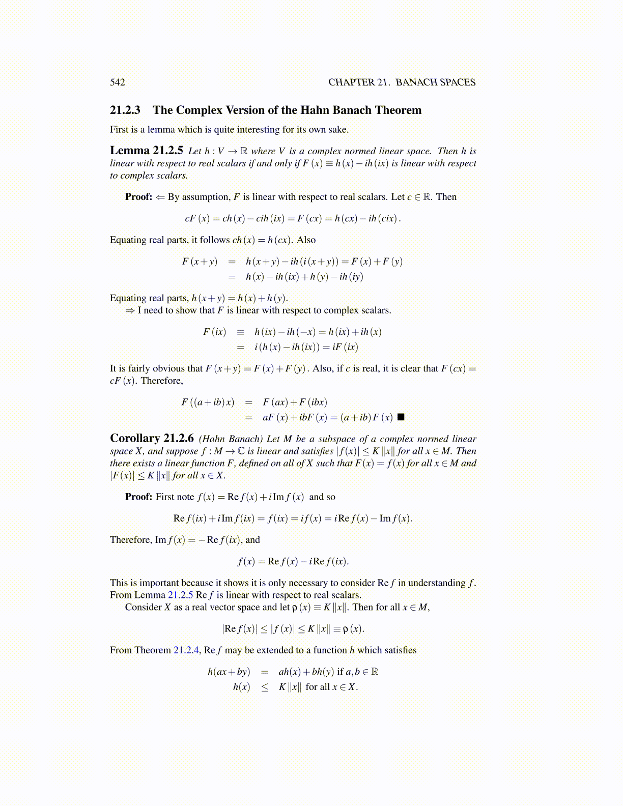 Corollary 21.2.6 (Hahn Banach) Let M be a subspace of a complex normed linearspace X, and suppose f : M→ C is linear and satisfies | f (x)| ≤ K ∥x∥ for all x ∈M. Thenthere exists a linear function F, defined on all of X such that F(x) = f (x) for all x ∈M and|F(x)| ≤ K ∥x∥ for all x ∈ X.